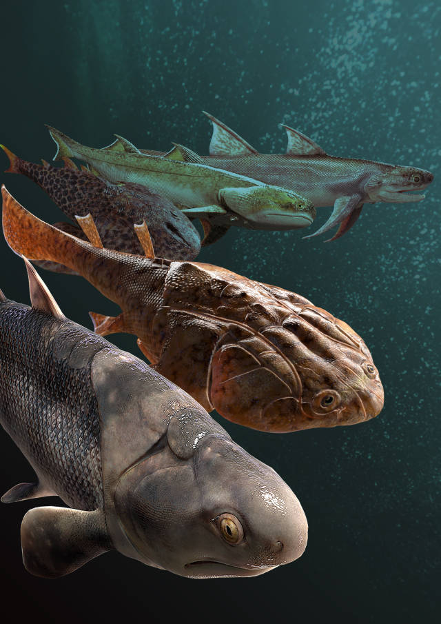 中国志留纪早期(兰多维列世,约4.4亿年前)五种古鱼的三维复原 (黔齿鱼,梵净山鱼,土家鱼,秀山鱼,沈氏棘鱼,自上而下)