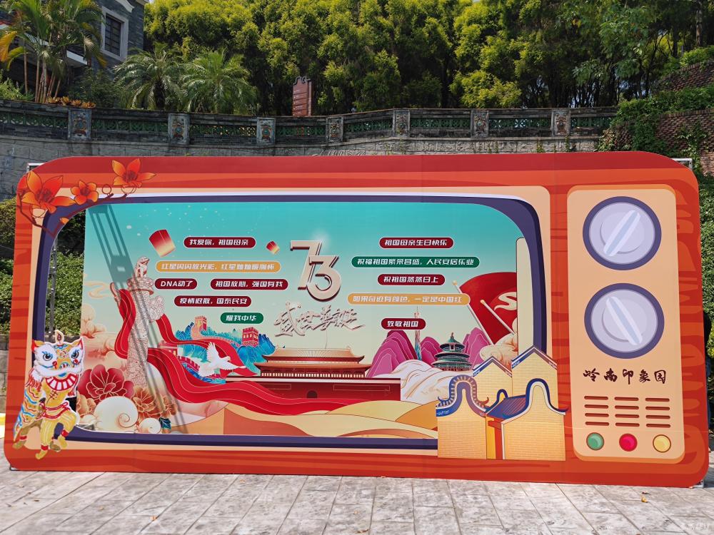 国旗飘扬,灯笼高挂,岭南印象园内一抹亮丽的“中国红”拉开节庆的序幕。园区不仅为入园游客准备了节庆小礼物,还设置了潮流又复古的立体电视造型打卡墙,游客可在满屏“赞赞新中国”弹幕前宣誓自己赤诚的中国心;练溪湖戏台挂起超大国旗,游客可在国旗下致敬、合影,抒发心底的爱国情怀。