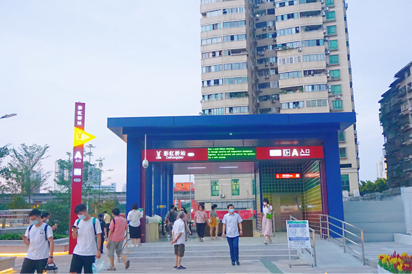 彩虹桥站有A、C、D三个出入口同步投入使用。其中,A出口位于彩虹曲苑对面,属金花街辖内,以后金花街坊出行更方便啦!A出口处还打造了小广场,配置了丰富的绿植,可供居民休闲。