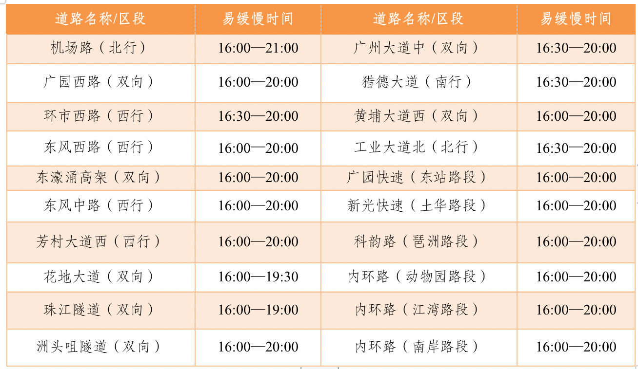 易缓慢路段为机场高速(三元里—蚌湖立交段)、华南快速路(龙洞收费站—春岗立交段)、华快三期(平沙立交—朝阳立交段)、北二环(蚌湖立交—龙山立交段)、大广高速(石岭互通)、广河高速(春岗立交—八斗立交段)、北三环(机场北立交—杨荷立交)、乐广高速(花山互通立交—花山隧道段)、广清高速(广清立交—朝阳立交段)、沈海高速(蚌湖立交—和顺立交段)、莞佛高速(坦尾立交—虎门大桥段)、南二环(鱼窝头立交—张松立交段)等瓶颈路段。同时,广佛高速沙贝服务区、横沙服务区、京港澳高速瓦窑岗服务区、广河高速正果服务区、大广高速从化服务区、乐广高速花城服务区、北二环高速火村服务区及北三环新安服务区等高速服务区,在高峰时段易出现车流密集,可能出现车流倒灌影响主线通行。
