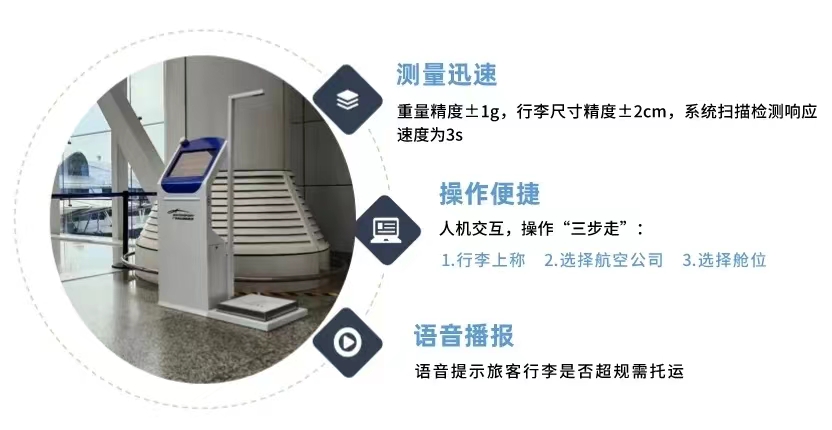 为此,白云机场进行独立自主研发,创新推出“行李智能测量机”,测量机能快速测量行李的体积和重量,并可智能匹配目前在一号航站楼运营的21家不同航空公司、不同舱位的行李限额要求。旅客只需将行李放置于行李智能测量机上,机器就能自动测量行李的重量和尺寸,通过机器屏幕手动选择航空公司和舱位,系统根据旅客航班信息智能匹配已写入程序的各航空公司的随身携带行李限额,快速判断旅客的随身携带行李是否超限,在屏幕上显示测量和比对结果,并配有声光提示。