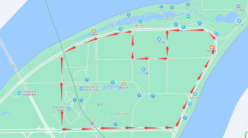 其中黄埔区生物岛地铁官洲站环线共设6个站点:地铁官洲站总站、寰宇一路、广州实验室、生物岛水墨园、寰宇二路口、地铁官洲站总站。每日载客测试服务时间为8:00~21:00,全天发班间隔15分钟/班。