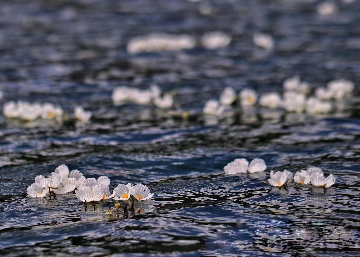 忽然湖面漂来一片白色花海随着水波流动,如同“白色精灵”在水面起舞。这就是泸沽湖上特有的珍稀水生植物——波叶海菜花,又称为海藻花、龙爪菜。每年5月~10月,湖面都会开出朵朵纯白的海菜花,三片白色花瓣簇拥着黄色花蕊,成片成片地漂浮在湖面,这也成为泸沽湖的奇景。“水清则花盛,水污则花败。”海菜花对水质的要求相当严苛,喜欢温暖干净的水体,只能生长在纯净的活泉水中,所以人们也形象地称她为“水质的试金石”。