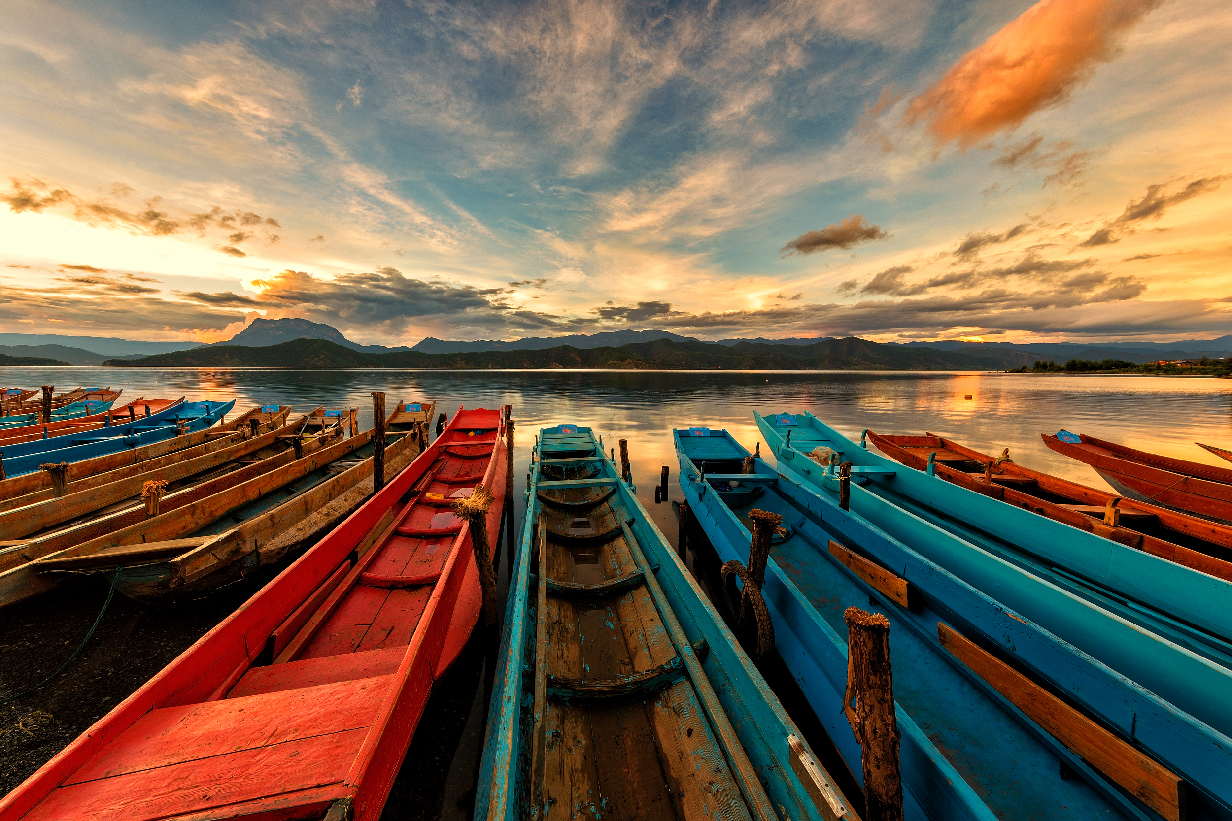 在湛蓝的湖水中,一艘艘小船随波荡漾,在湖面上或草海中穿梭……这一叶叶来自远古、五颜六色的小舟,由一根粗壮的圆木镂空,两头削尖而成。要探寻泸沽湖最真实的样子,就是坐上小舟,划入湖心,揭开它美丽而神秘的面纱。