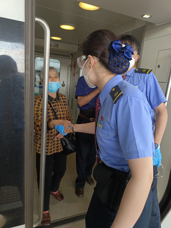 “今天幸好有你们的帮助,不然我们两个老人家肯定走不了。”广州南站三层客运值班室,刚在救护车上做完身体检查、正准备坐车去北海的彭奶奶对工作人员周梦珂、郭茜连连称赞!
