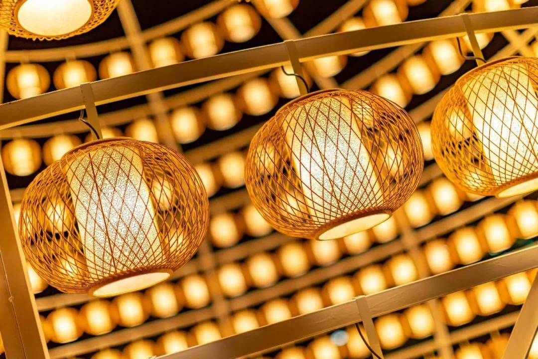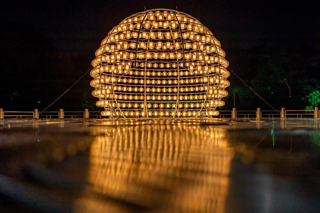 作为花间月色的主角,以团圆作为设计主题,采用广东省级非遗“沙河鸟笼工艺”传统技艺编织而成的数百只灯笼,在滟湖之畔,组合形成直径达8米的大型镂空球体,汇聚人们团圆之情。作品倒影水中,小灯笼散发着光芒组合为一颗耀眼的大灯笼,就如每一份小团圆汇聚成大大的幸福,亦如家是最小国,国是千万家。有家、有国,是“小确幸”,也是“大团圆”。