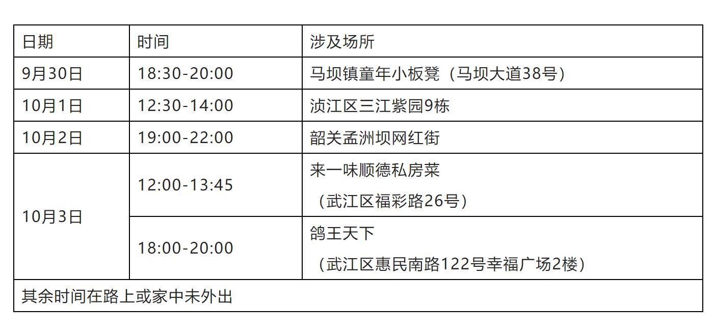 流调溯源等相关工作正在进行中,重点场所待更新,请广大市民群众及时关注。请与病例同一时段同一地点有交集人员及时向浈江区、曲江区疫情防控指挥办报备(电话:浈江区0751-8916120;曲江区0751-6481188、0751-6482381 )。
