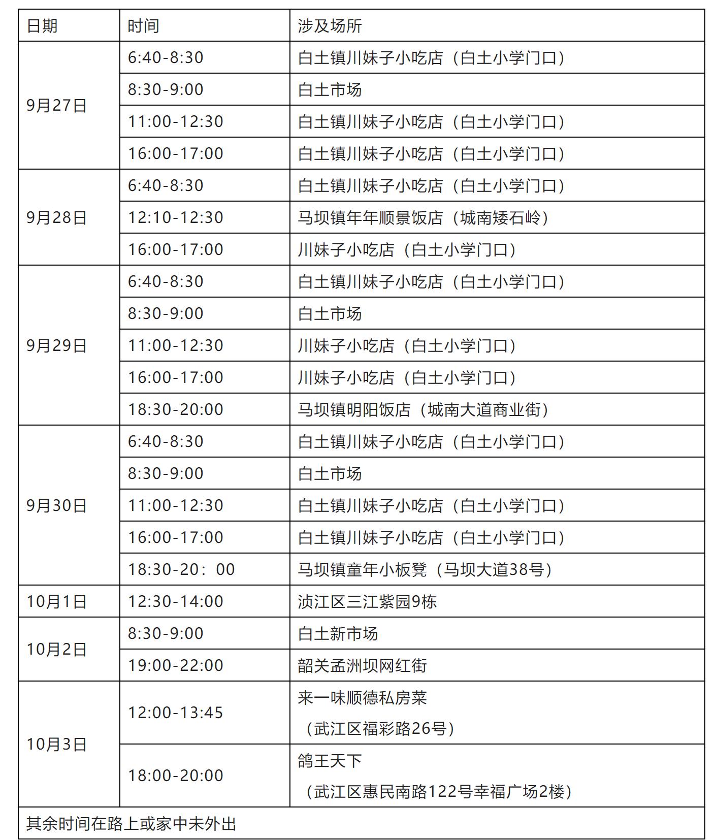 本土确诊病例2:陈某某,女,35岁,在病例1聚餐,居住在白土镇下乡村,目前已转运至定点医院隔离治疗。轨迹如下: