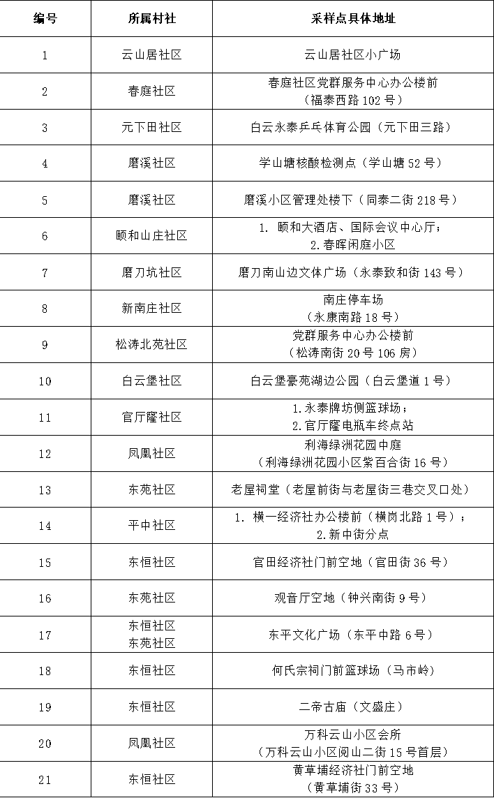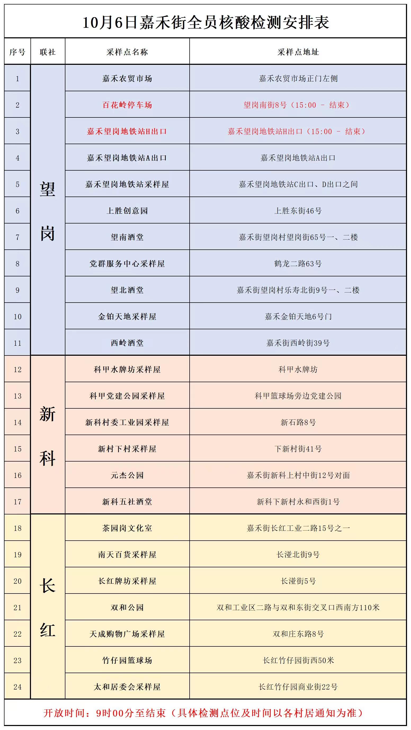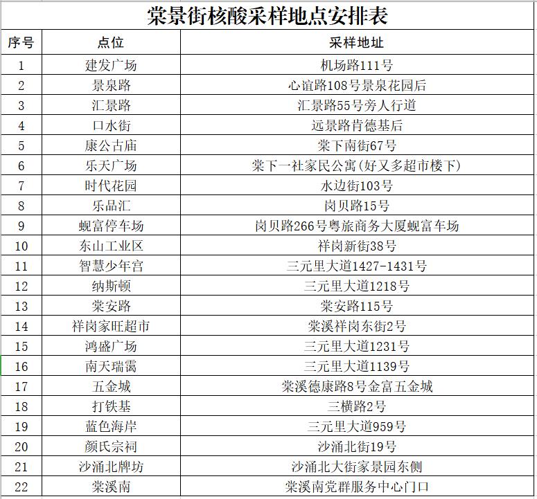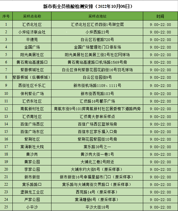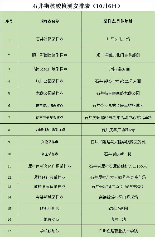 10月6日,白云区棠景街、新市街、石井街、永平街等多街道开展全员核酸检测工作。具体情况如下:
