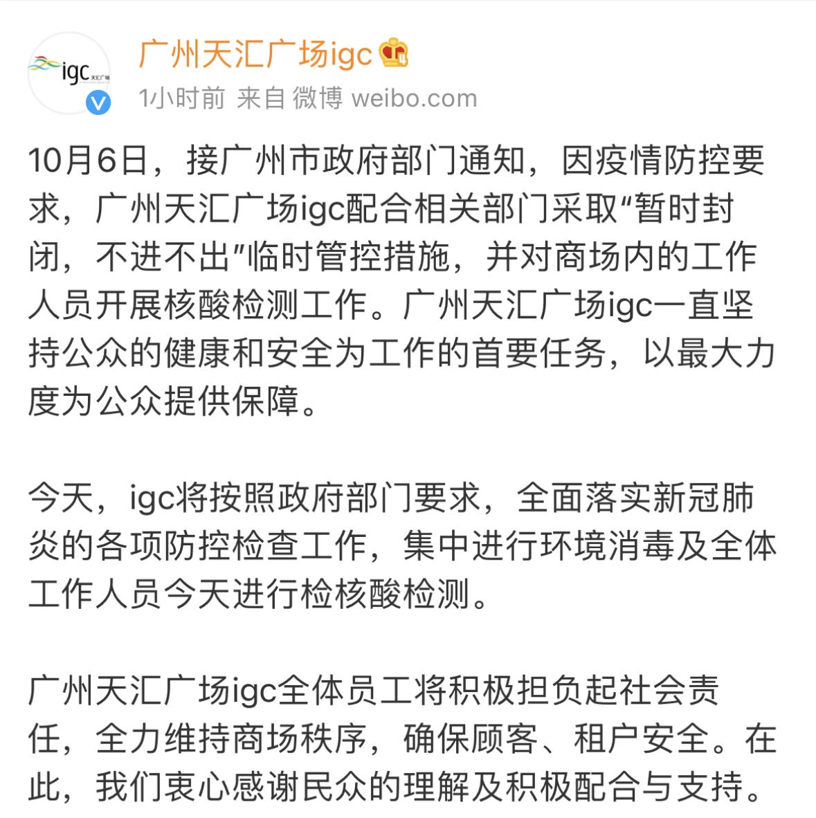 记者从@广州天汇广场igc 获悉,10月6日,接广州市政府部门通知,因疫情防控要求,广州天汇广场igc配合相关部门采取“暂时封闭,不进不出”临时管控措施,并对商场内的工作人员开展核酸检测工作。