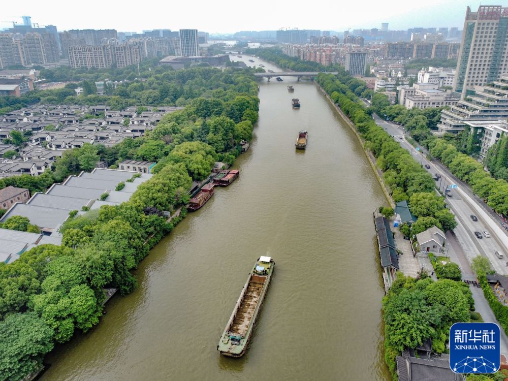 ↑货船行驶在大运河杭州段(2022年5月27日摄,无人机照片)。