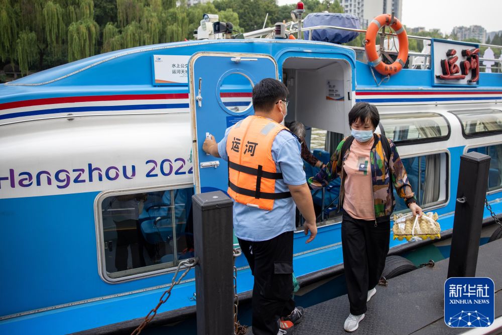 ↑居住在大运河周边的杭州市民乘坐“运河”号水上巴士出行(2022年9月29日摄)。