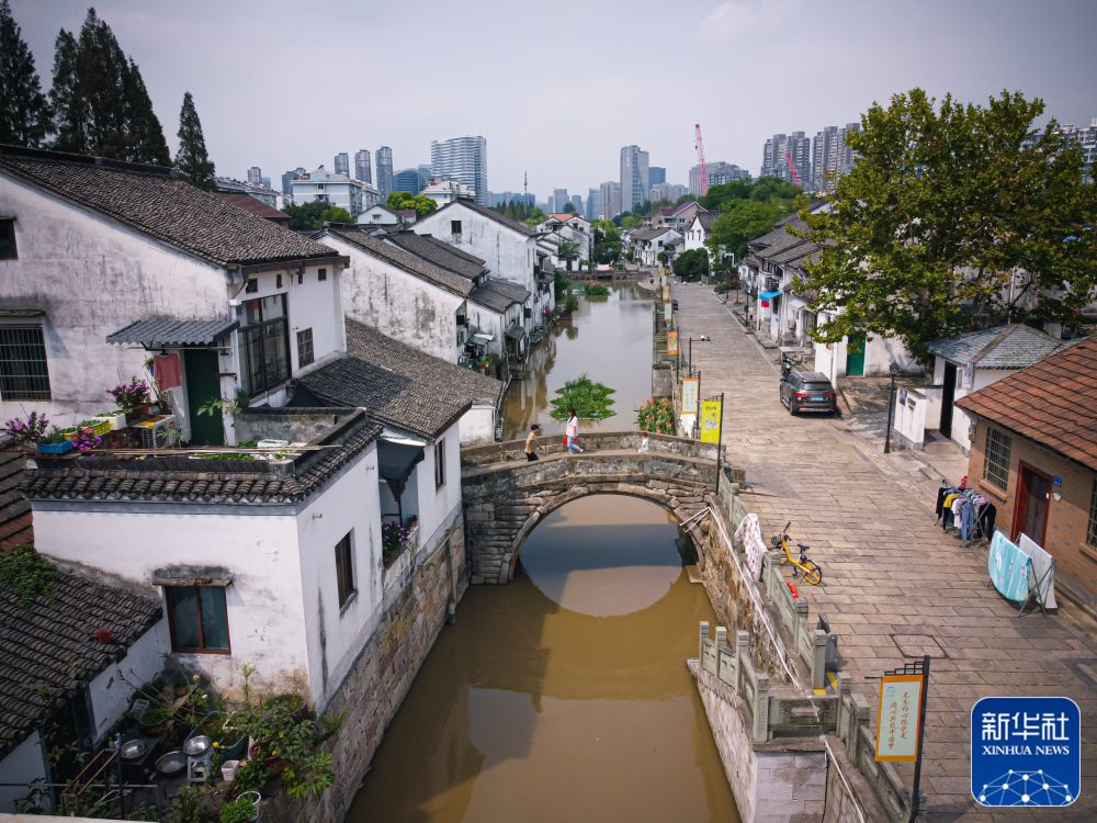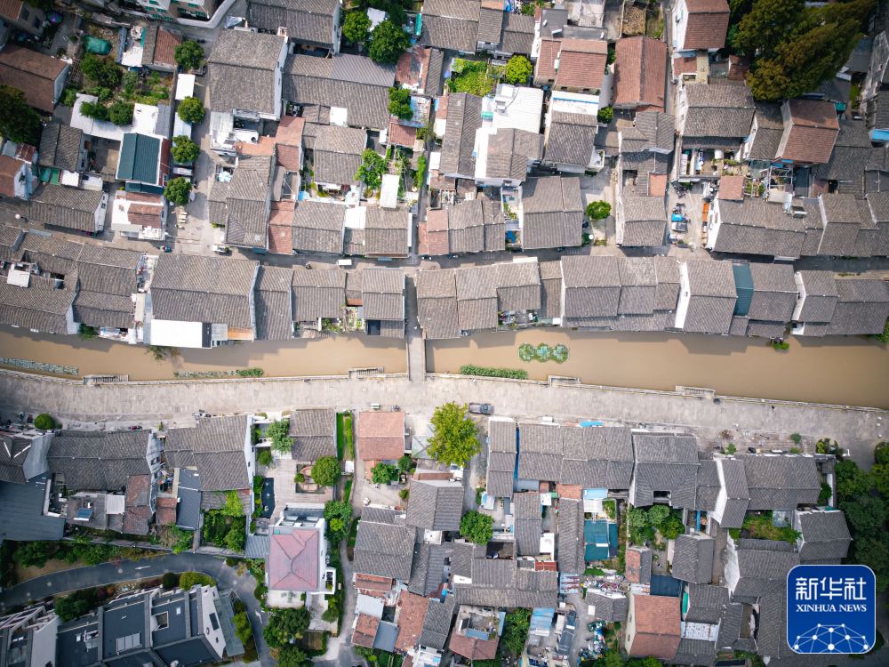 ↑从杭州西兴老街流淌而过的浙东运河(2022年9月27日摄,无人机照片)。