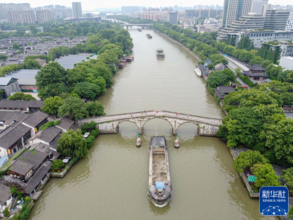 ↑行驶在大运河上的货船通过杭州拱宸桥(2022年5月27日摄,无人机照片)。