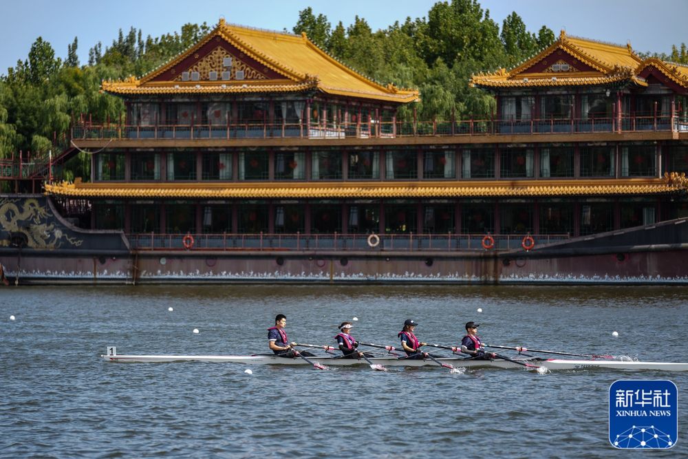 ↑市民在位于北京市通州区的京杭大运河上进行赛艇比赛(2022年9月18日摄)。