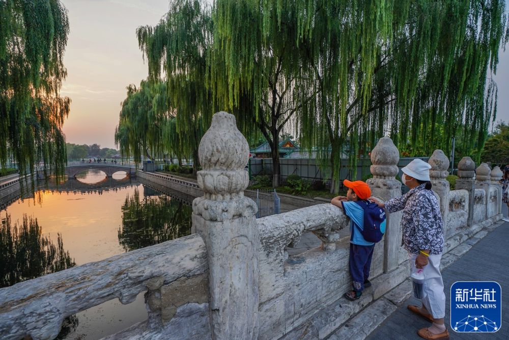 ↑市民在京杭大运河和北京中轴线交汇点的万宁桥上眺望什刹海(2022年9月28日摄)。