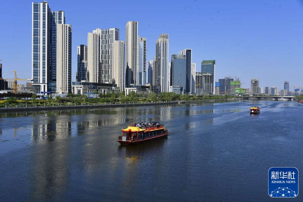 ↑游船驶过位于北京市通州区的运河商务区(2020年4月26日摄,无人机照片)。