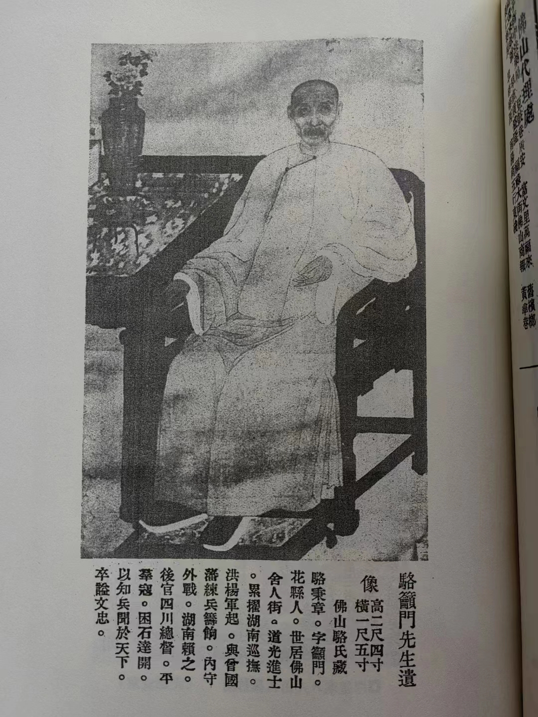 据骆秉章研究会有关负责人介绍,近日,一幅从未面世的骆秉章坐姿画像在佛山出现。画像刊载于民国时期佛山著名武术刊物《佛山精武月刊》。该画像的发现者是佛山市博物馆副研究馆员、市非遗保护中心办公室主任张雪莲。今年九月份,在一个偶然的机会,她接触到一本1927年佛山出版的《佛山精武月刊》。在插图页上,竟赫然刊载有清朝高官骆秉章坐姿画像。画像题目为“駱籲門先生遗像”。像中,骆秉章身穿白色长袍,脚蹬白底黑面鞋,安坐于太师椅上,目视前方,神态悠然。右侧八仙桌上,古瓷瓶中鲜花盛放。画幅高两尺四寸、横一尺五寸。注明由佛山骆氏收藏。