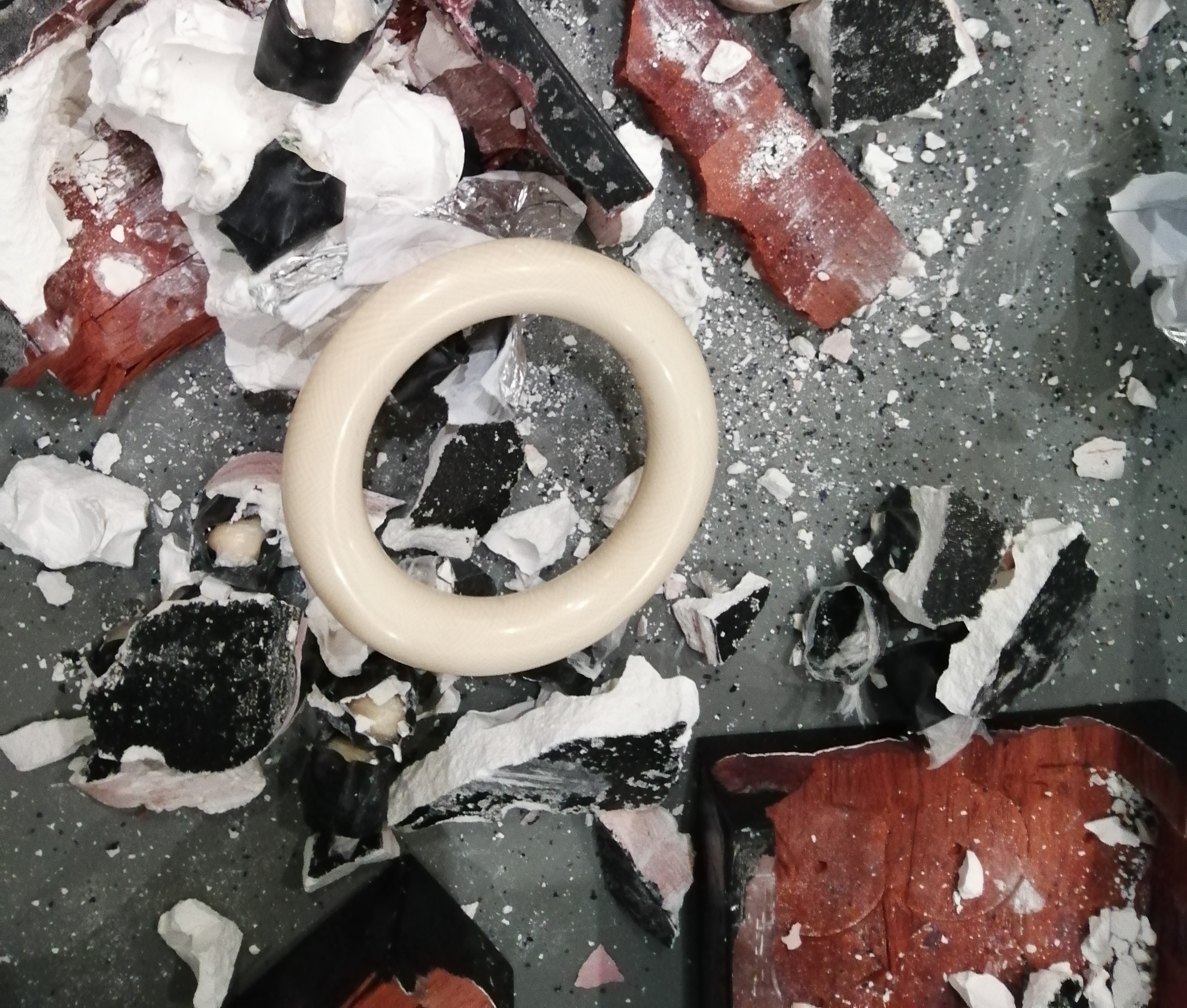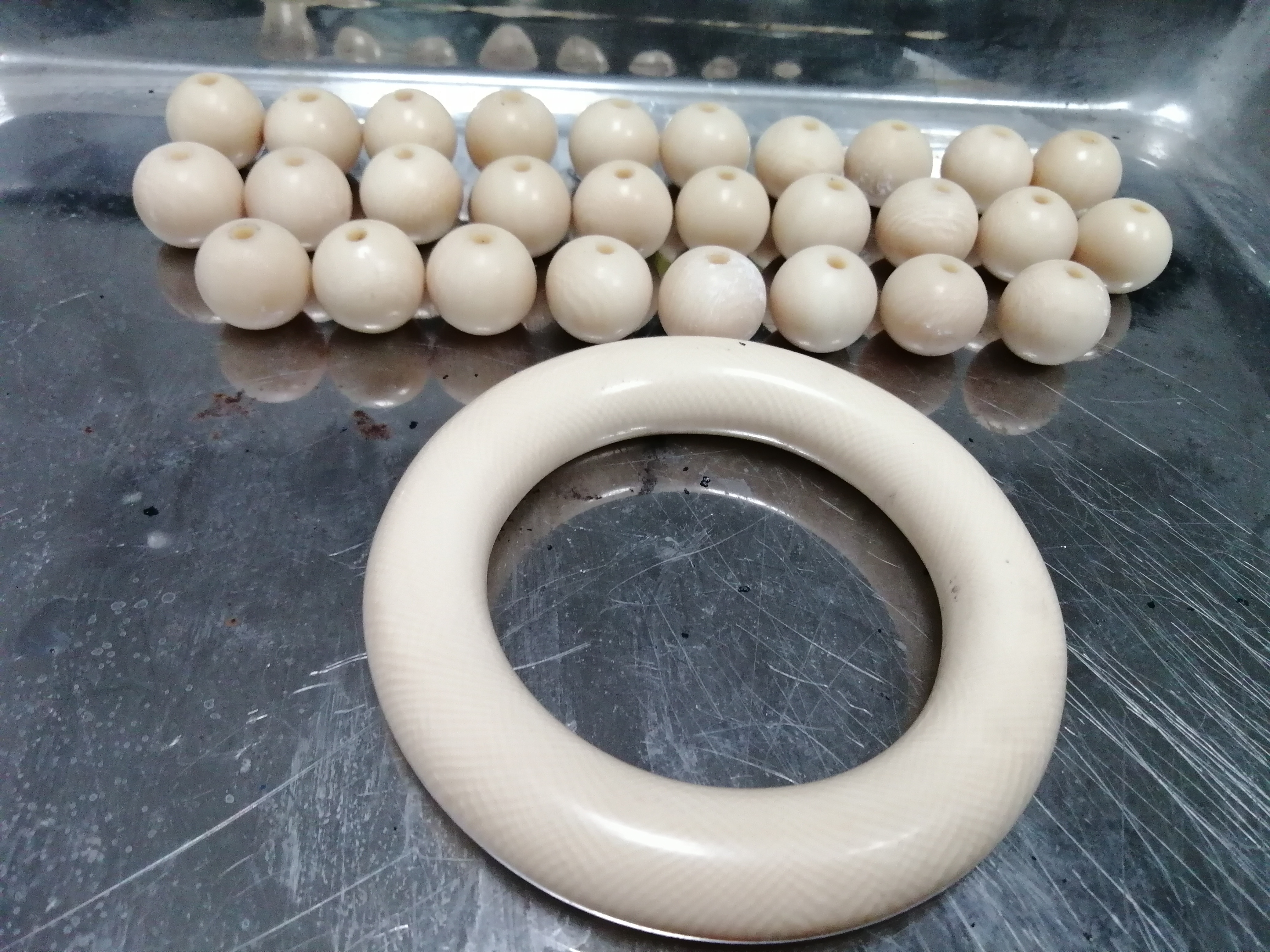 现场检查中,关员在堆满衣物的行李箱里发现两个与首饰盒大小相近的黑色正方体木盒,木盒表面残留有后期封装痕迹,过机图像显示木盒内藏有手镯、珠子类物品。关员随即要求旅客对木盒进行拆卸,发现其中夹藏着用石膏、锡纸塑料膜进行多层封装的乳白色手镯及珠子共29件,表面均带有象牙特有的“利兹纹”,疑似象牙制品。经送专业机构鉴定,确定上述手镯和珠子为现代象的象牙制品。