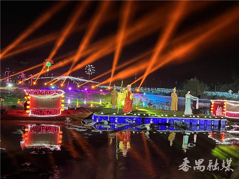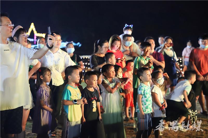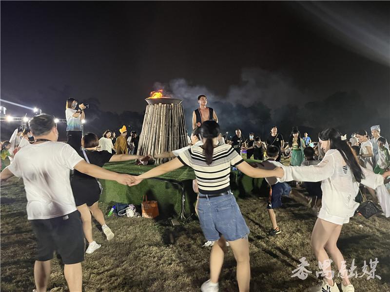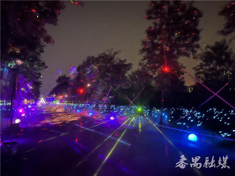 2000多亩七彩斑斓的灯饰,加上3D投影离子喷雾,很有热带雨林的感觉,穿越“星空”步道,进入如梦如幻的迷雾夜光森林,萤火虫灯饰随风摇曳,十二生肖卡通灯俏皮可爱……往里走,就来到了篝火晚会现场,这里有火焰、歌声、舞蹈,有一群人的精彩狂欢。黄雯雯住在海傍村附近,这是她今年第二次来海傍水乡游玩,“前段时间来这里赏黄风铃和油纸伞,最近听说有夜间灯光秀、情景剧表演、篝火晚会等活动,就想再来玩一下。”