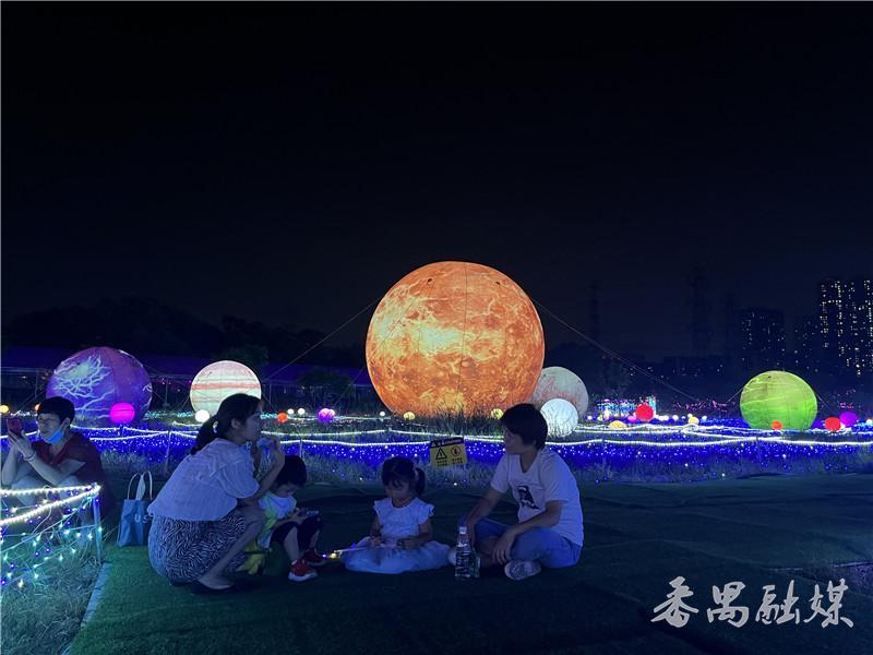 姜女士的儿子芃芃今年9岁了,平时酷爱天文知识,听同学说海傍水乡有宇宙主题的灯光秀,也想让妈妈带他来体验一下。他说,这里还原了宇宙星球的场景,艺术与科技巧妙的结合,让人感觉非常震撼,像置身在童话世界,又像飞行在璀璨夜空。太空宇航员、浩瀚星海……每个元素之间彼此联结,有超强的趣味互动性,让人意犹未尽。芃芃兴奋地和妈妈说,今天的日记内容就写这场宇宙外太空光影之旅,回学校后还要分享给同学,相信他们也会想来这里体验一下这个梦幻时空。姜女士看着儿子开心的模样,也觉得这趟乡村灯光秀体验旅行很充实,自己沉浸在其中,也好像有穿越时空的感觉,体验感很好。