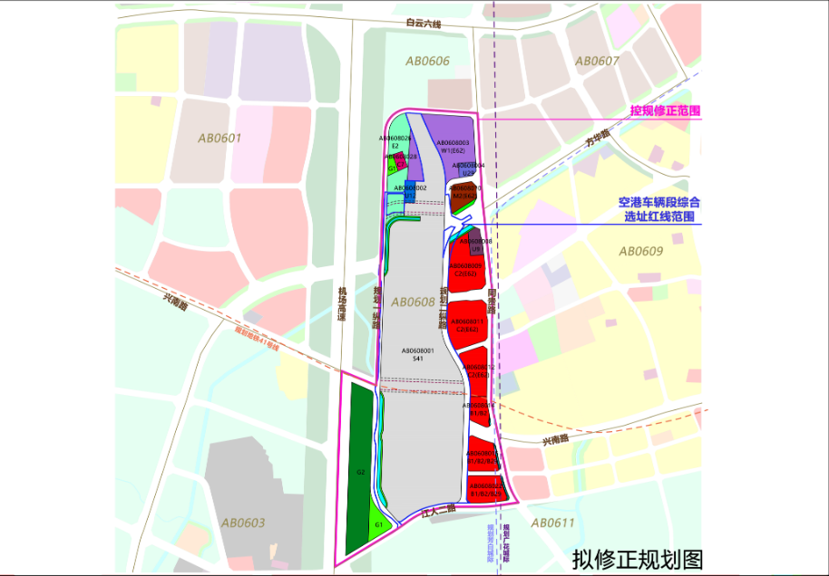 规划用地和指标方面,依据空港车辆段选址红线, 将AB0608004、AB0608010等27个地块涉及的部分合并为AB0608001地块,用地性质修正为公共交通场站用地(S41),用地面积为466130平方米。依据元洲变电站迁改选址范围,将AB0606006. AB0606008等4个地块涉及的部分合并为AB0608002地块,用地性质修正为供电用地(U12),用地面积为4747平方米。规划修正范围内,规划地块总净用地面积由现行控规79公顷修正为84公顷,共增加5公顷;总建筑面积由现行控规122万平方米修正为42万平方米,共减少80万平方米。