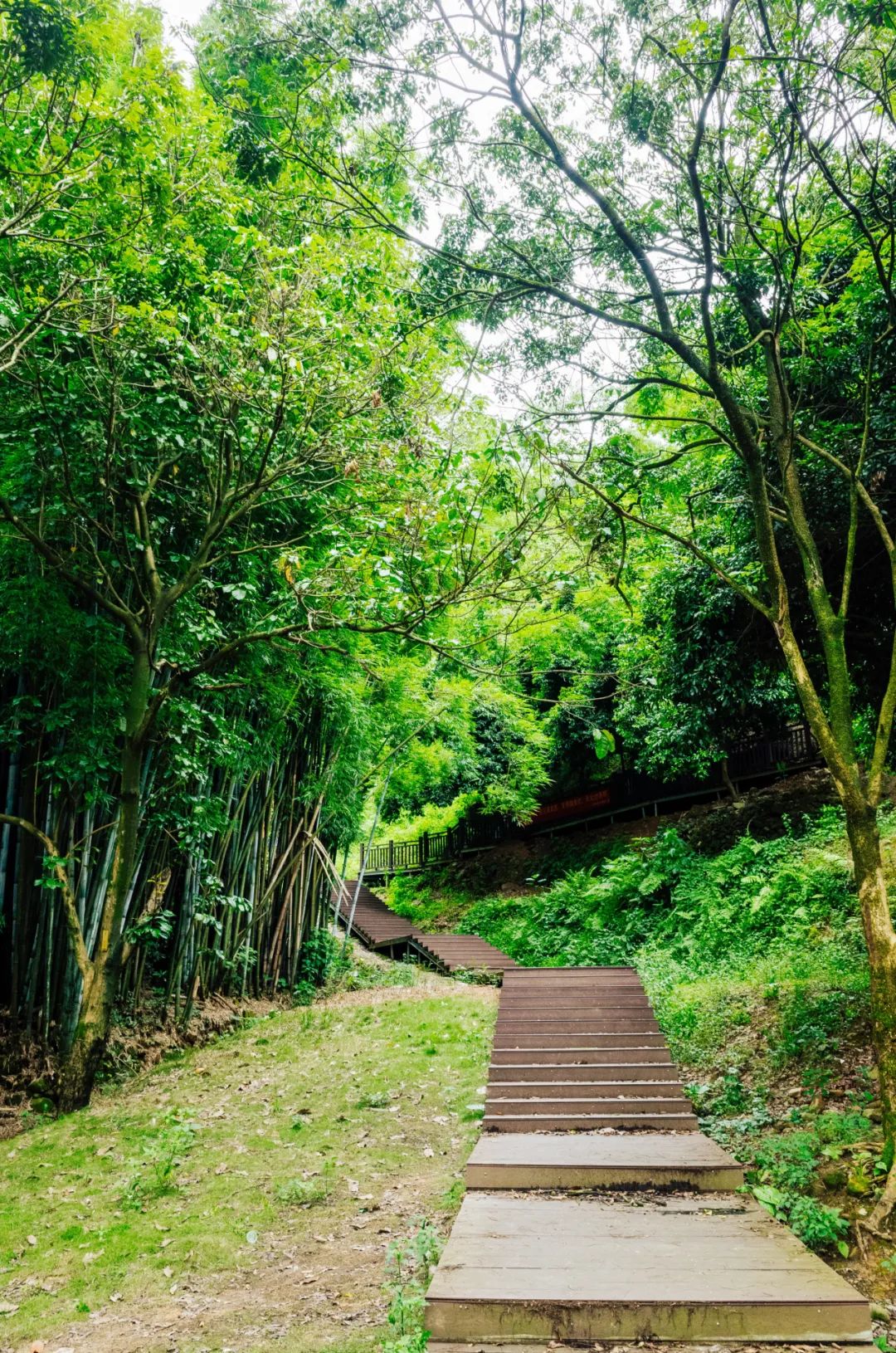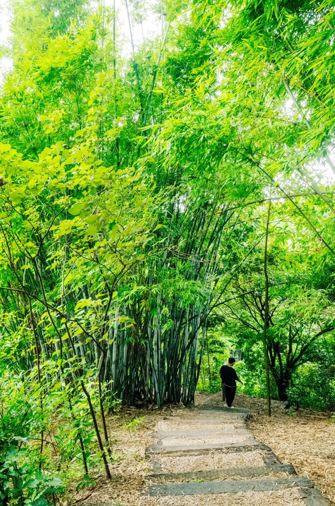 从黄麻主入口踏入步道,行走在类似铁道枕木的路面,两侧翠竹挺拔,郁郁葱葱。
