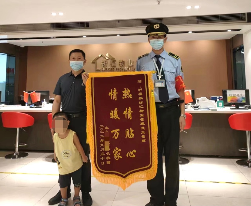 近日,广州市番禺区祈福新邨小区一业主到物业服务中心送上一面“热情贴心 情暖万家”的锦旗,感谢祈福物业工作人员帮助其找到孩子。