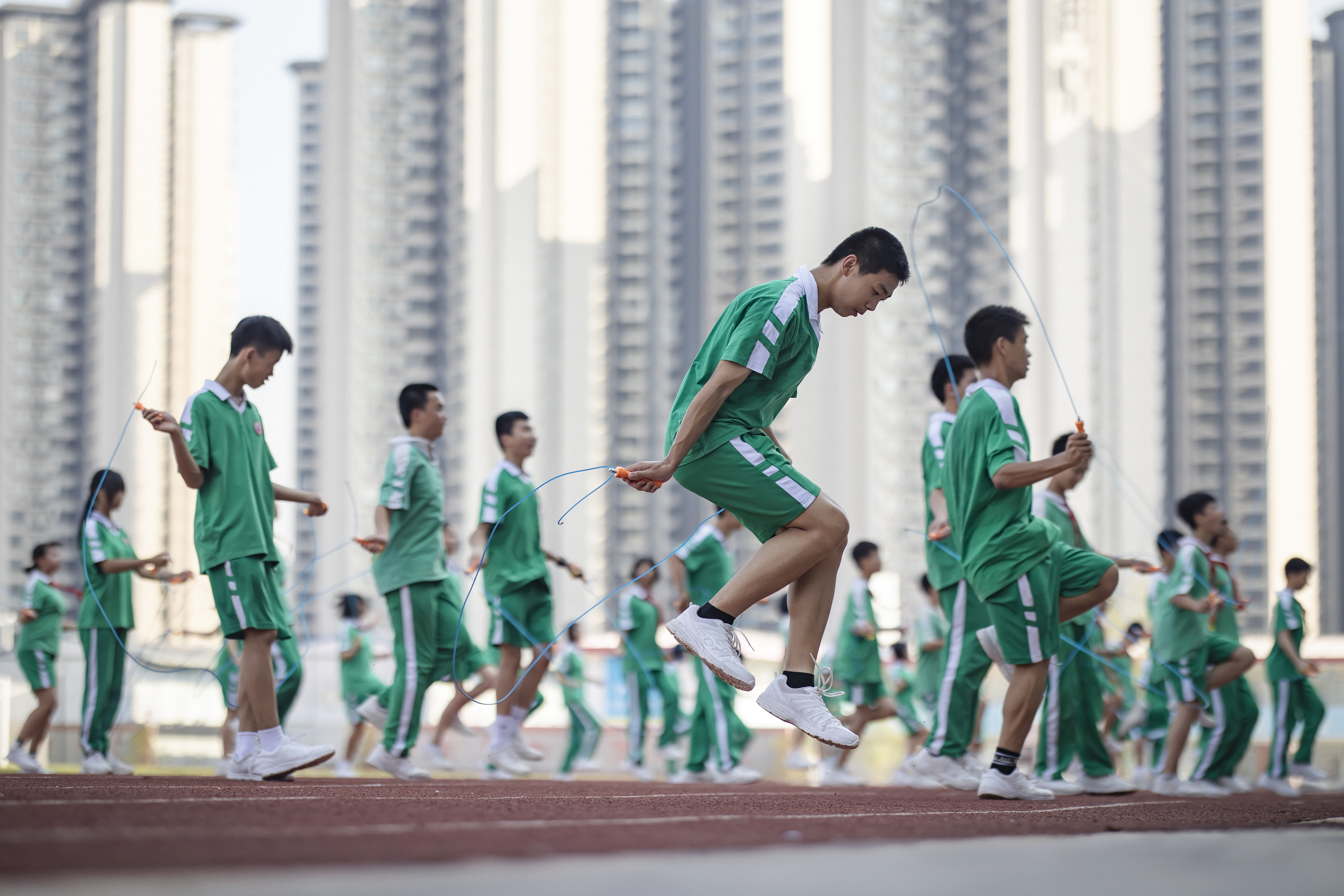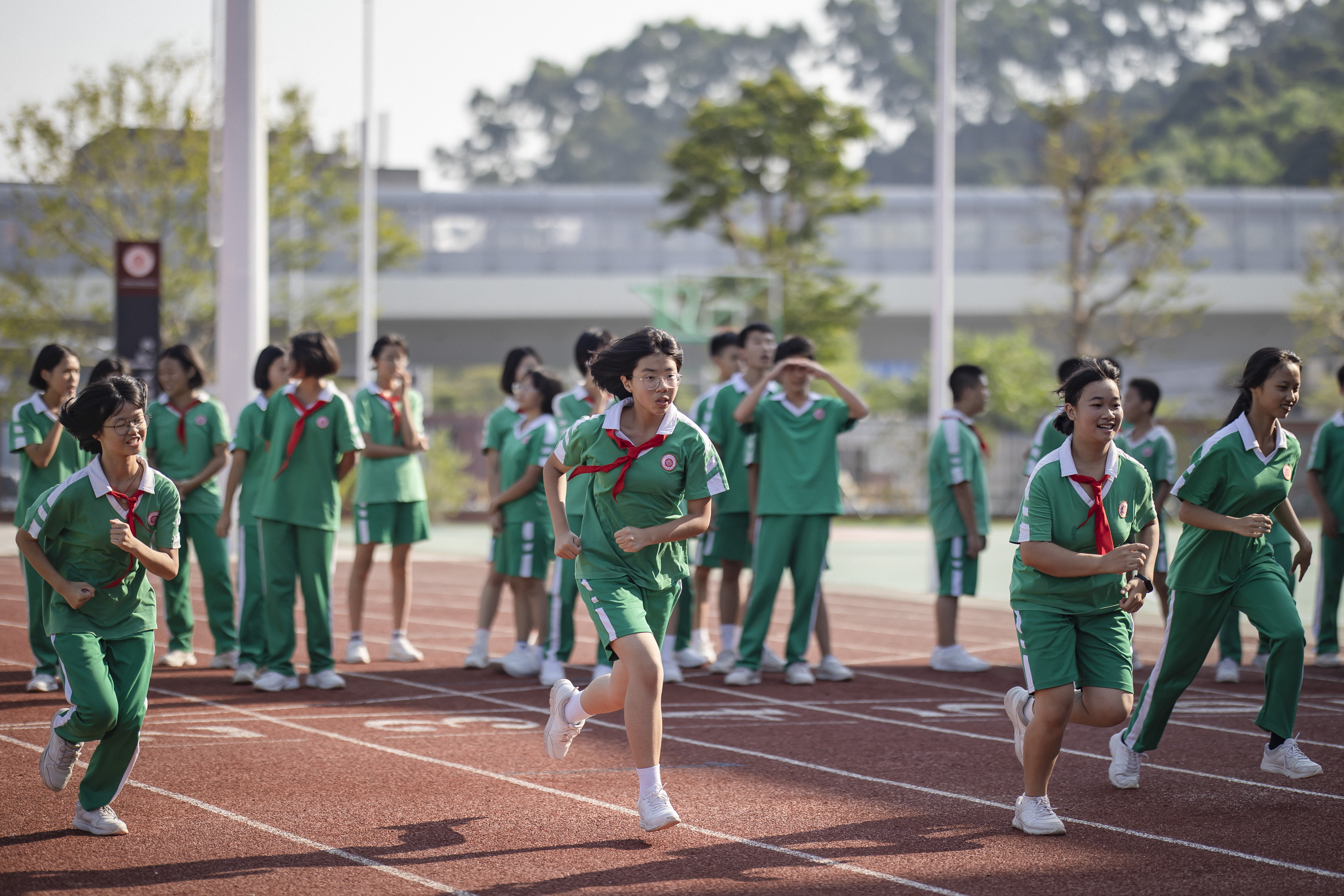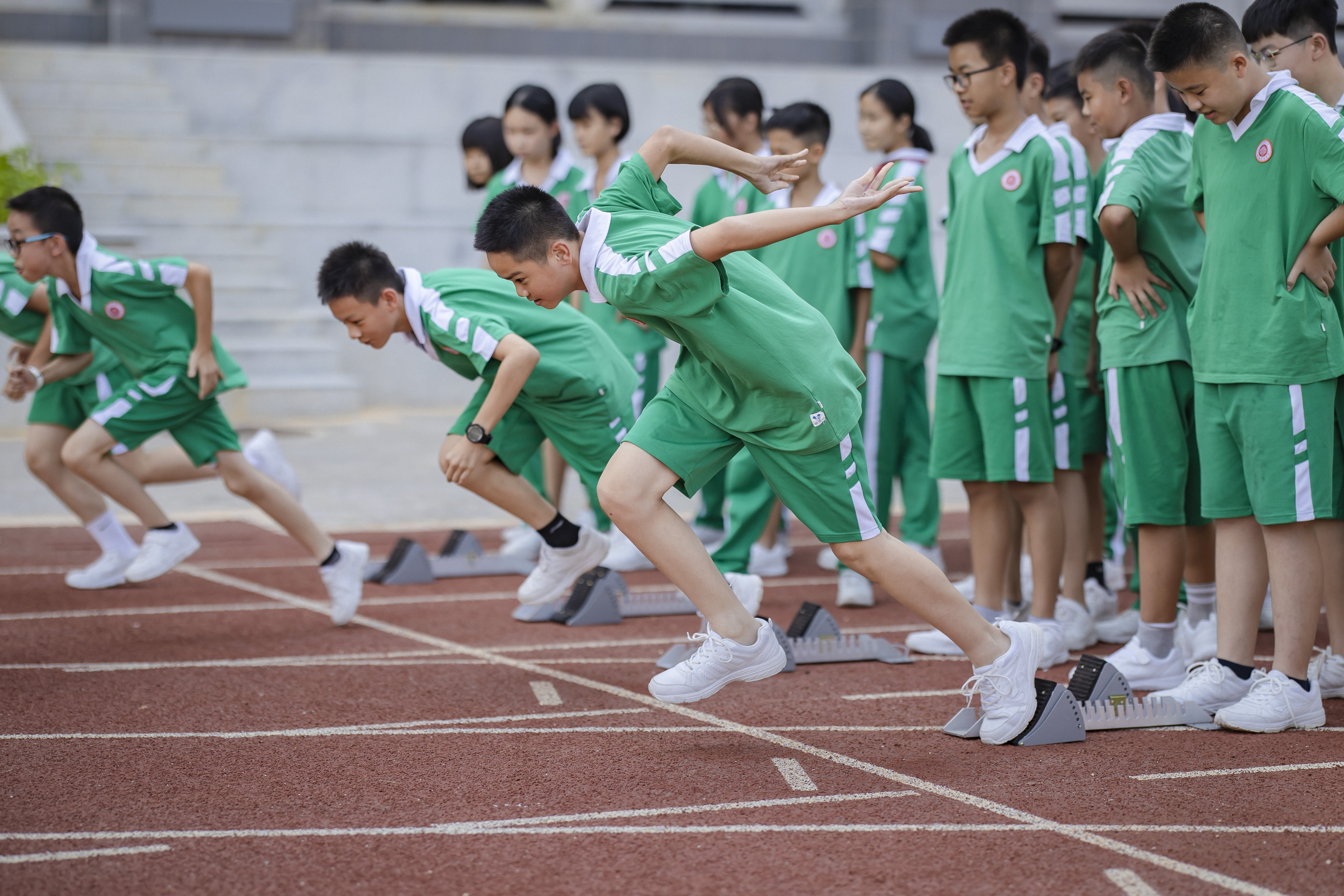探校当天,有班级正在足球场上体育课。初二学生林梓橦对记者说,她在校园里最喜欢的地方就是体育场。每天下晚自习后,她都会去体育场跑步或散步,每次运动后的感觉都像“考完一场试后,释放了所有压力”。她于上学期加入足球校队,在其中体验到足球的魅力就在于九十分钟内,与队友一起拼搏到进球的那一刻。