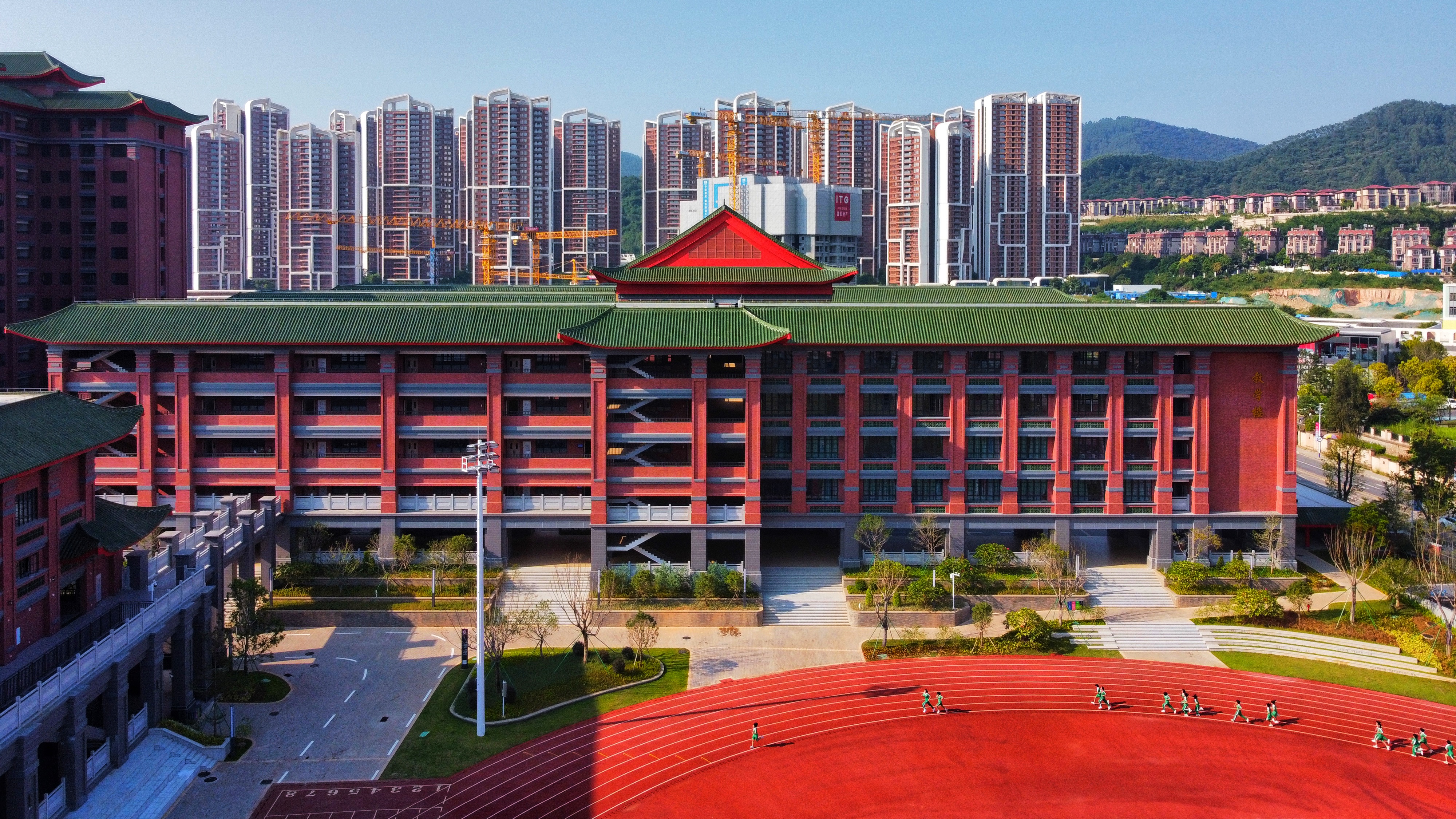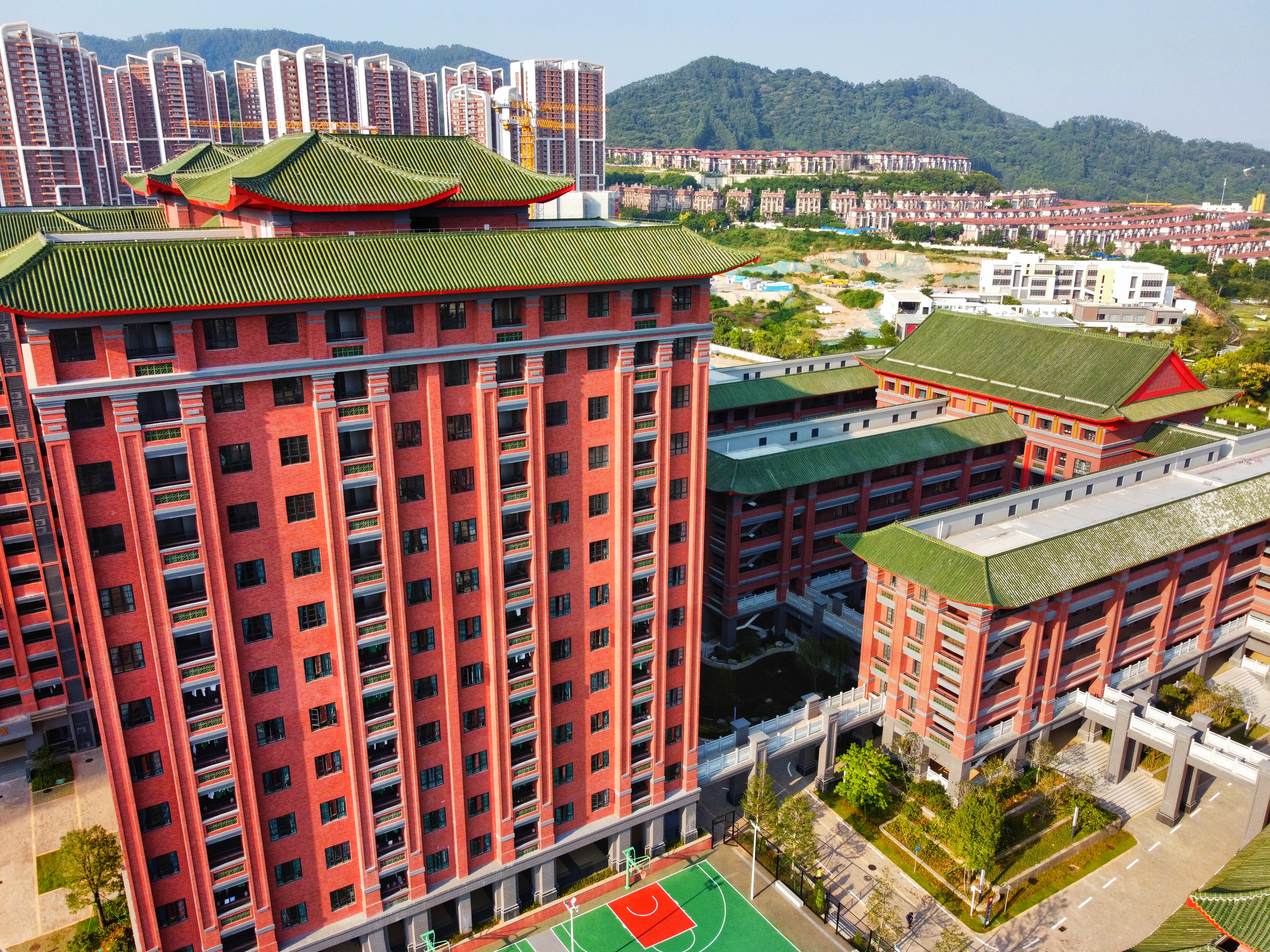 在执信增城北校区,穿过庄严古朴的执信大门,便是气势恢宏的综合楼。如果俯瞰校园,可以看到校园建筑为清一色红墙绿瓦,岭南书院气质浓郁,其中点缀了环楼荷塘、篮球场以及采用真草皮的足球场。