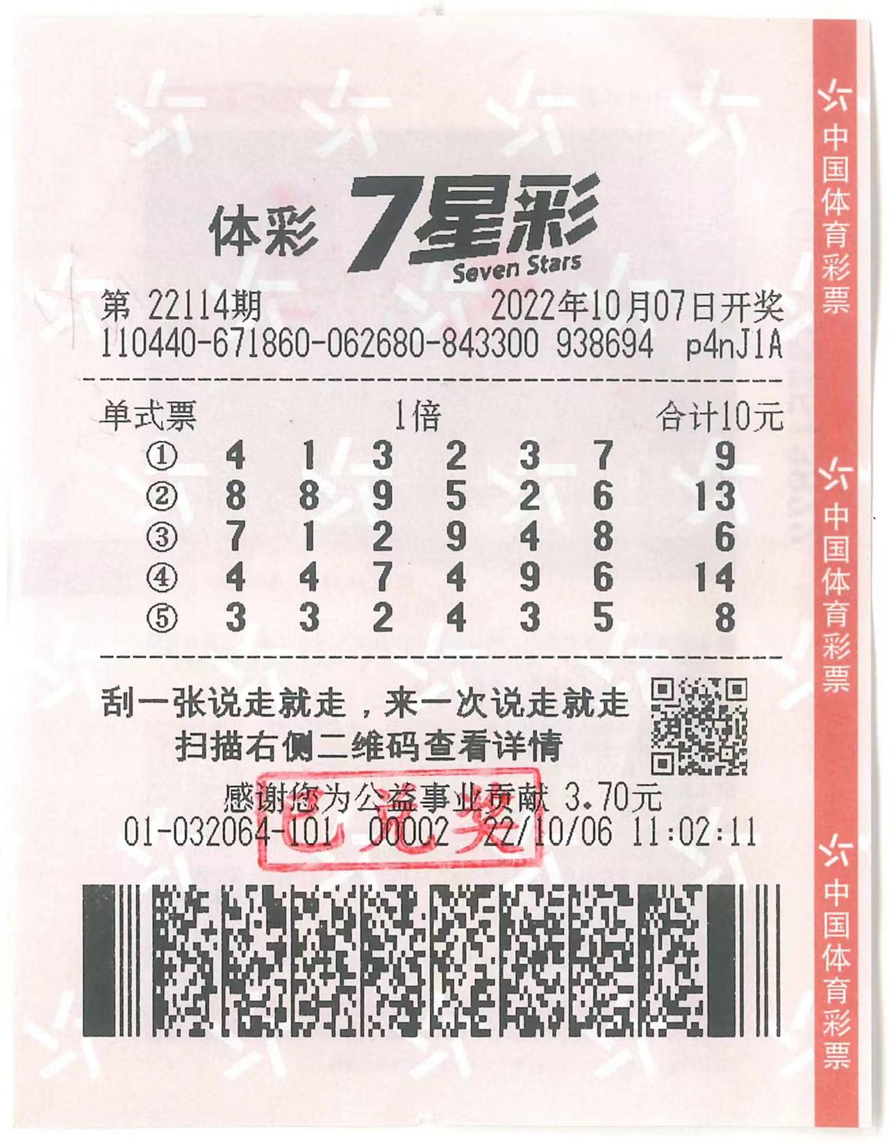 10月7日,中国体育彩票第22114期7星彩开奖号码为“889526+13”,全国共开出2注一等奖,每注奖金500万元,其中1注落在广州市越秀区共和大街15号103的4401032064实体店。这是广州体彩今年中出的第二个7星彩头奖。