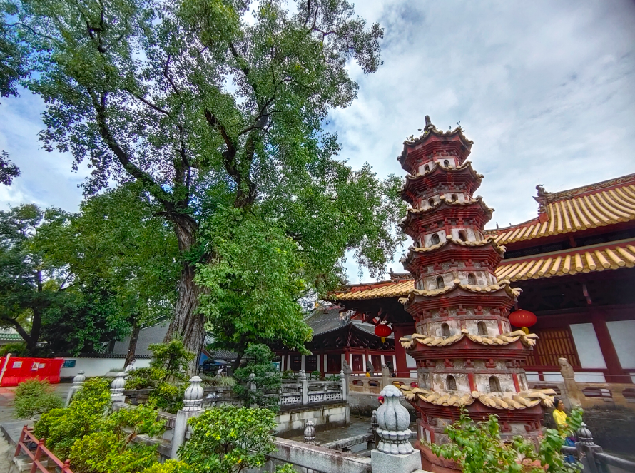 光孝寺,广东著名古建筑群之一,位于光孝路北端近净慧路处。据《光孝寺志》记载,初为公元前二世纪南越王赵建德之故宅。三国时代,吴国虞翻谪居于此,辟为苑囿,世称虞苑。虞翻死后,家人舍宅作寺。寺名曾几次更改,初名制止寺,东晋隆安五年(401年)称五园寺,唐代称乾明法性寺,五代南汉时称乾亨寺,北宋时称万寿禅寺,南宋时称报恩广孝寺,不久后改广字为光字,改名光孝寺。