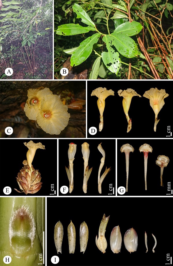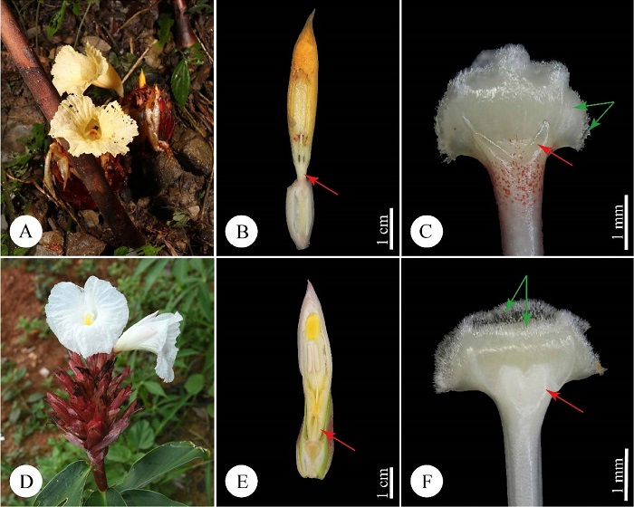 结果表明该属是并系类群,其中花序基生的类群形成单系分支,花序顶生的类群与小唇姜属构成姐妹类群。在形态学方面,除了花序位置不同,花序基生与顶生的类群在柱头、每节具腋芽数目、花冠管形态、唇瓣形态、苞片排列紧密程度等方面都存在明显差异。