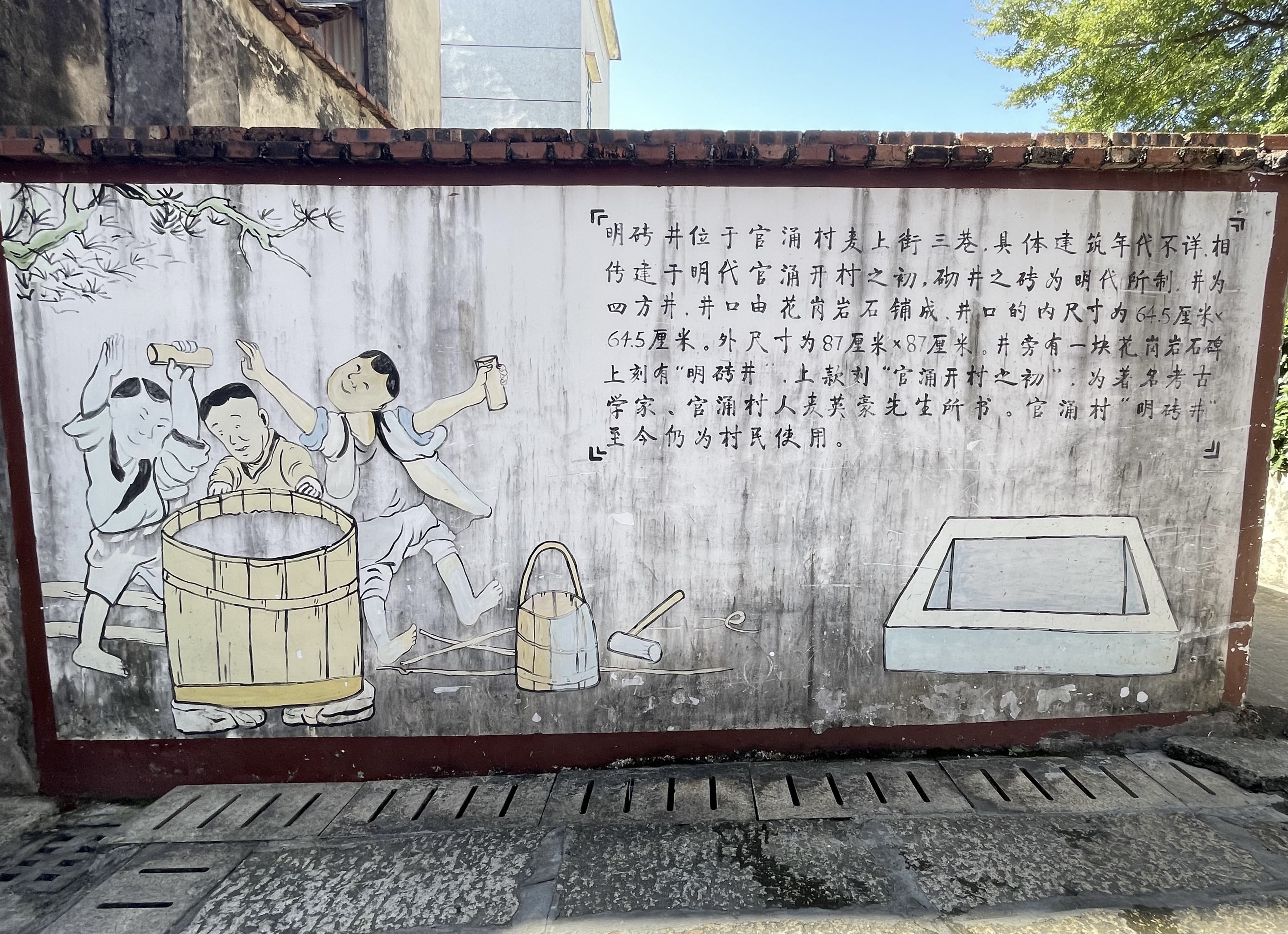 古井旁一处简介显示:明砖井建于明代官涌开村之初,砌井之砖为明代所制。井为四方井,井口由花岗岩石铺成,井口的内尺寸为 64.5 厘米 x 64.5 厘米,外尺寸为 87 厘米 x 87 厘米。井旁有一块花岗岩石碑,上刻有“明砖井”,上款刻“官涌开村之初”,为著名考古学家、官涌村人麦英豪先生所书。