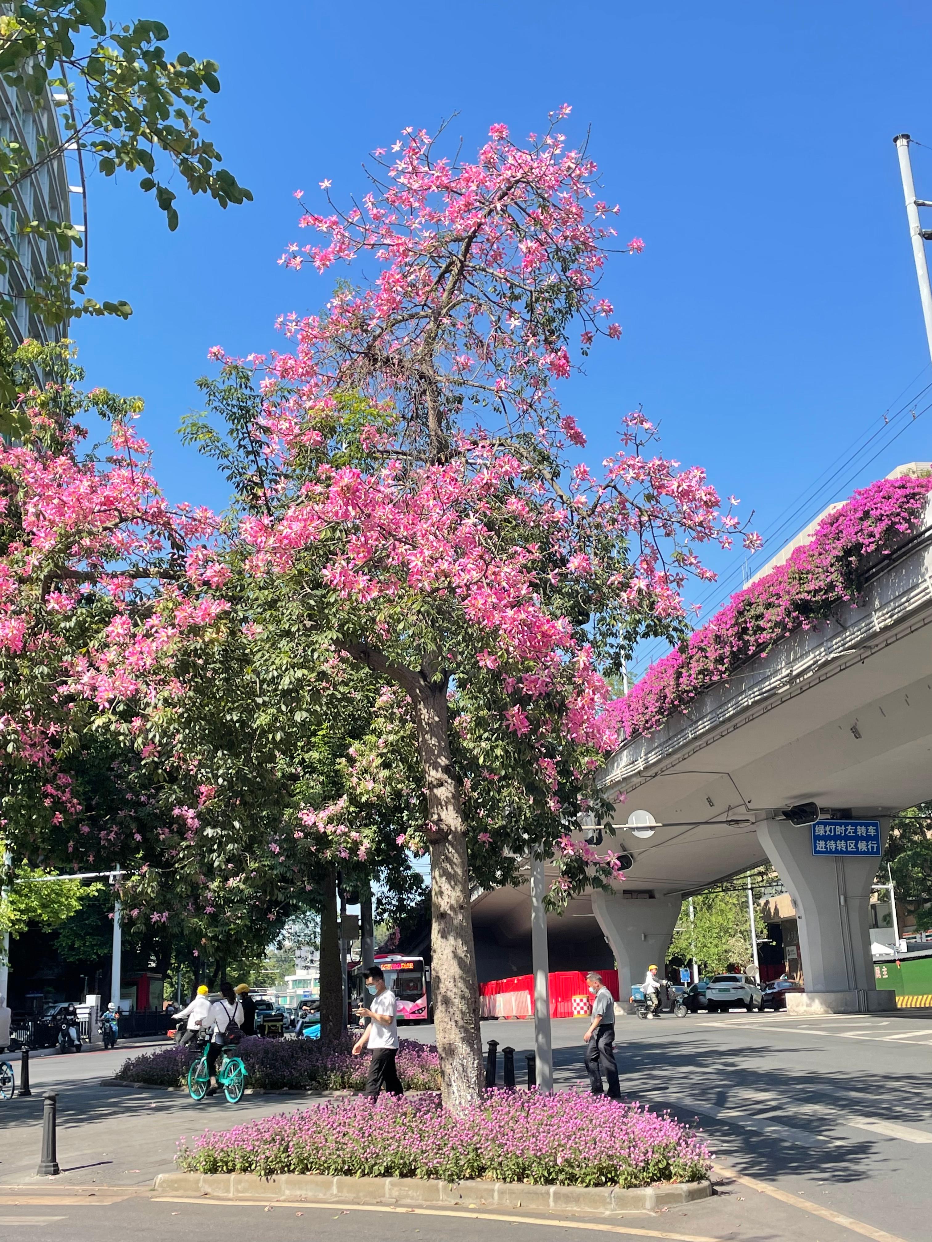 眼下这个时节,盛放的异木棉最惹人注目。据悉,异木棉的花期是每年10月至12月,如今已经进入了赏花期。