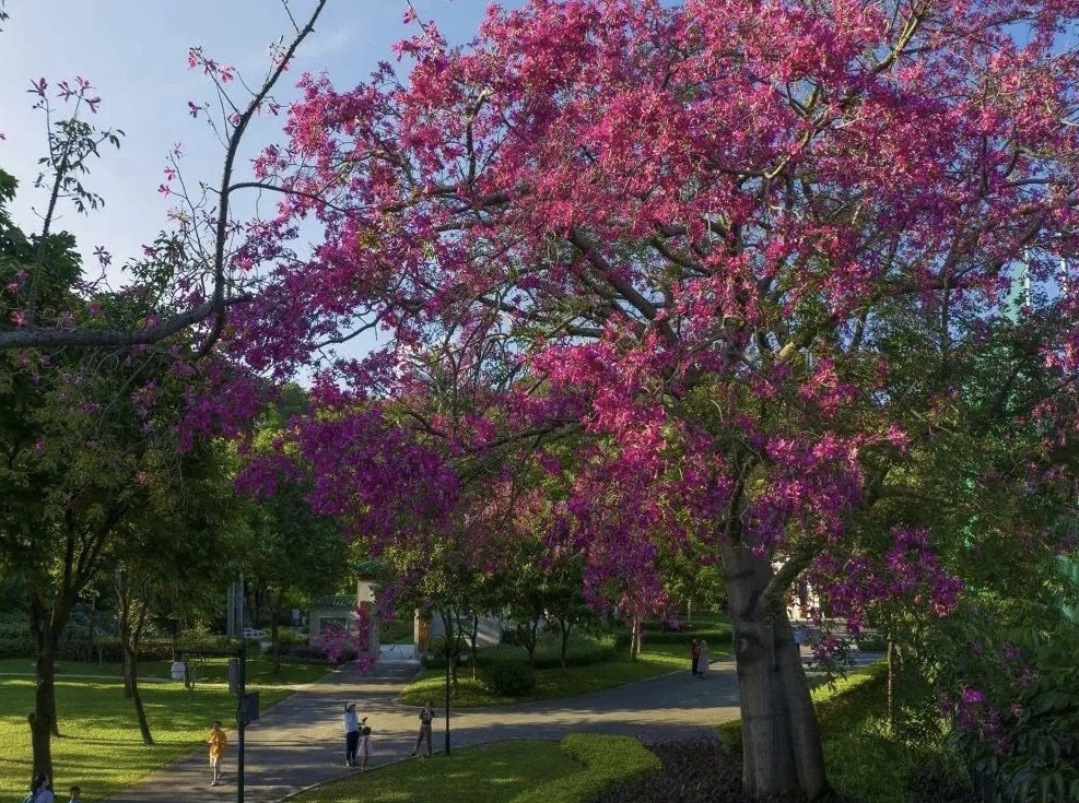 在麓湖公园的聚芳园内,大腹木棉、美丽异木棉陆续开花,一簇簇粉色的花,在暖阳的照耀下,为秋日的城市增添了浪漫的气息。