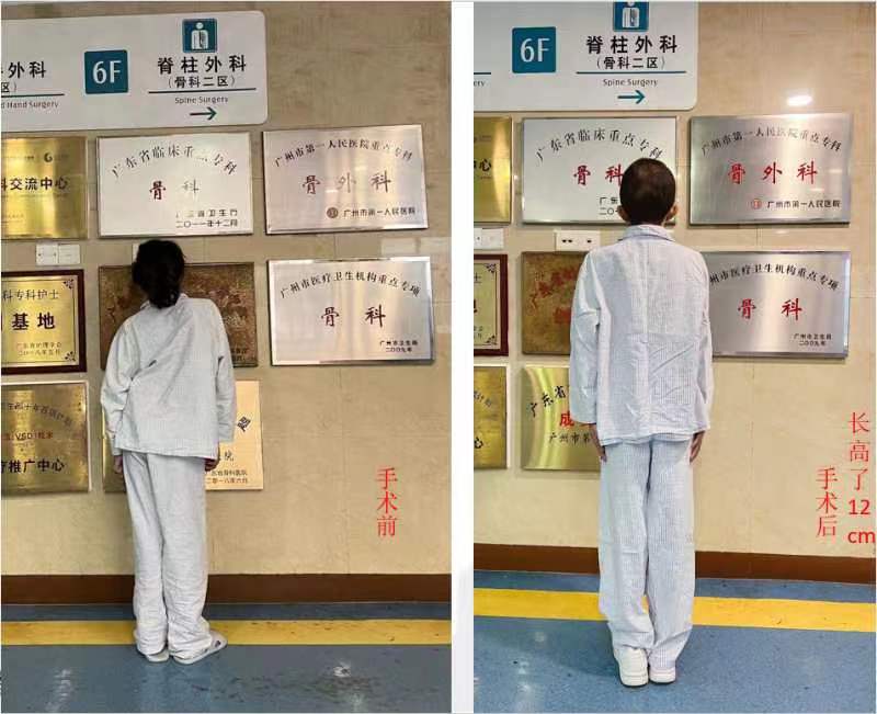 高难度的矫形手术在脊柱外科温世锋主任团队的共同努力下顺利完成。术后经过精细的医疗护理,小琴很快能挺直了脊梁下床活动,身高从原来的127厘米到术后的139厘米,整整长高了12厘米!困扰了小琴十几年的问题终于得到解决,她终于可以挺直脊梁走路了!