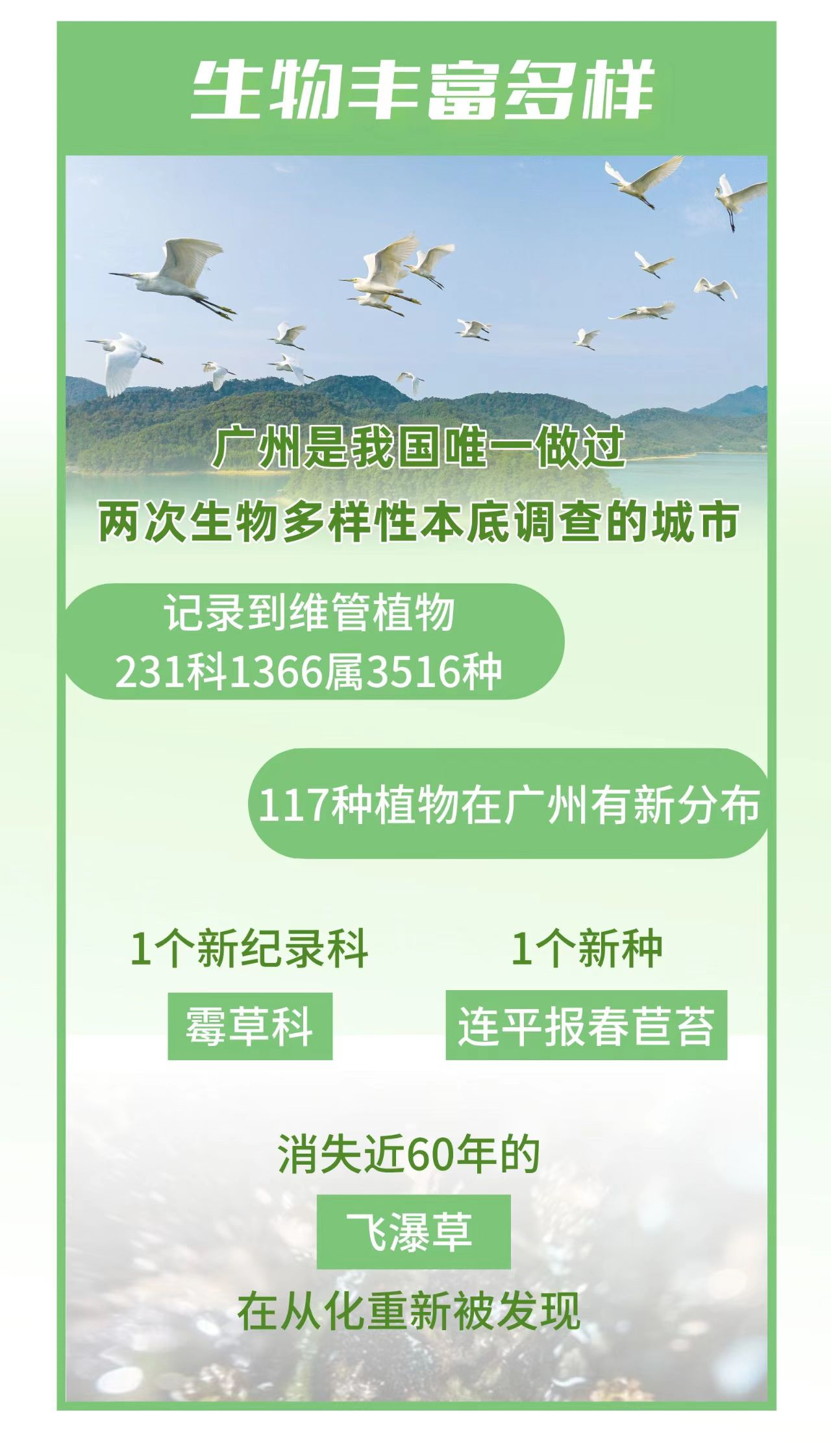尤其值得一提的是,广州是我国唯一做过两次生物多样性本底调查的城市。据最新一次生物多样性本底调查显示,广州记录到维管植物231科1366属3516种。