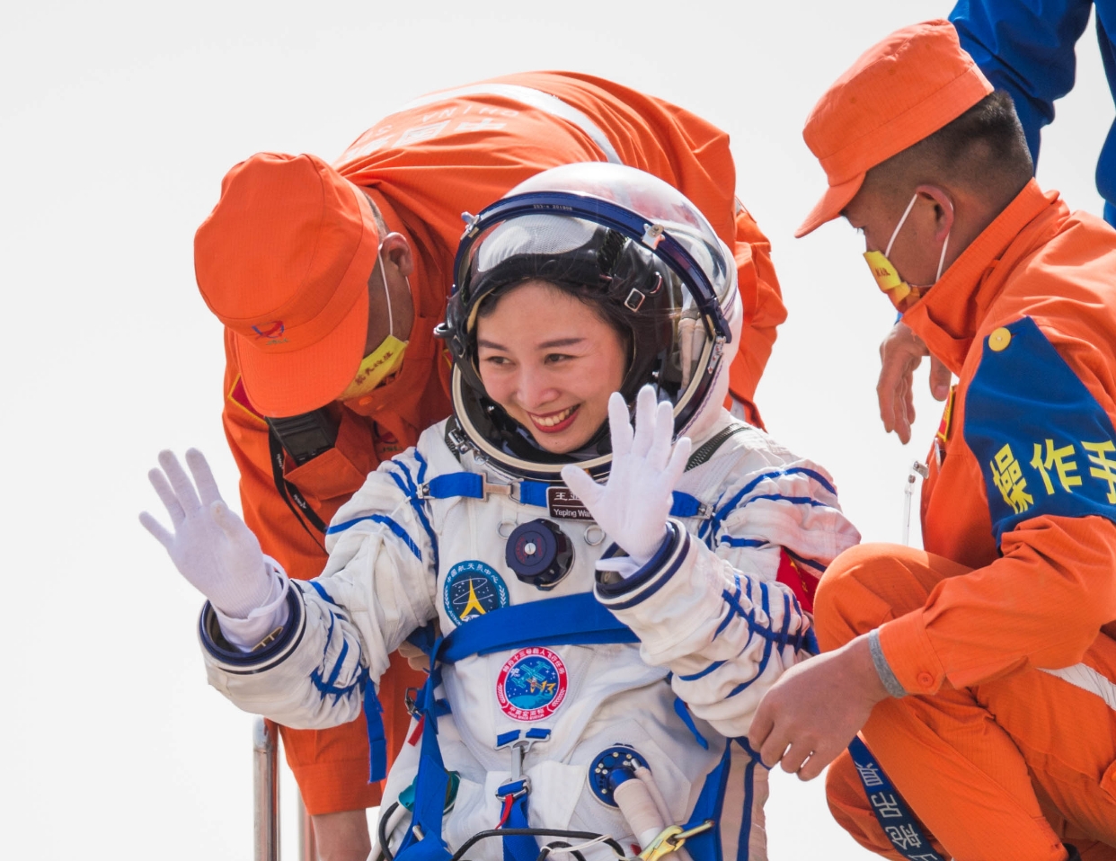 2022年4月16日,神舟十三号载人飞船返回舱在东风着陆场预定区域成功着陆,航天员王亚平安全顺利出舱。