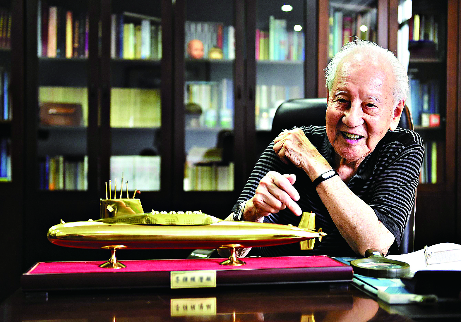2017年7月5日,中国工程院院士黄旭华在办公室与核潜艇模型合影,他是中国第一代核动力潜艇研制创始人之一。