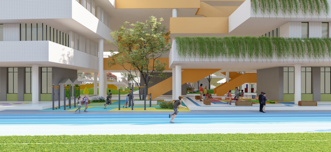 学校东南侧滨水,西侧为城市绿化带,景观资源丰富,绿地率达35%。