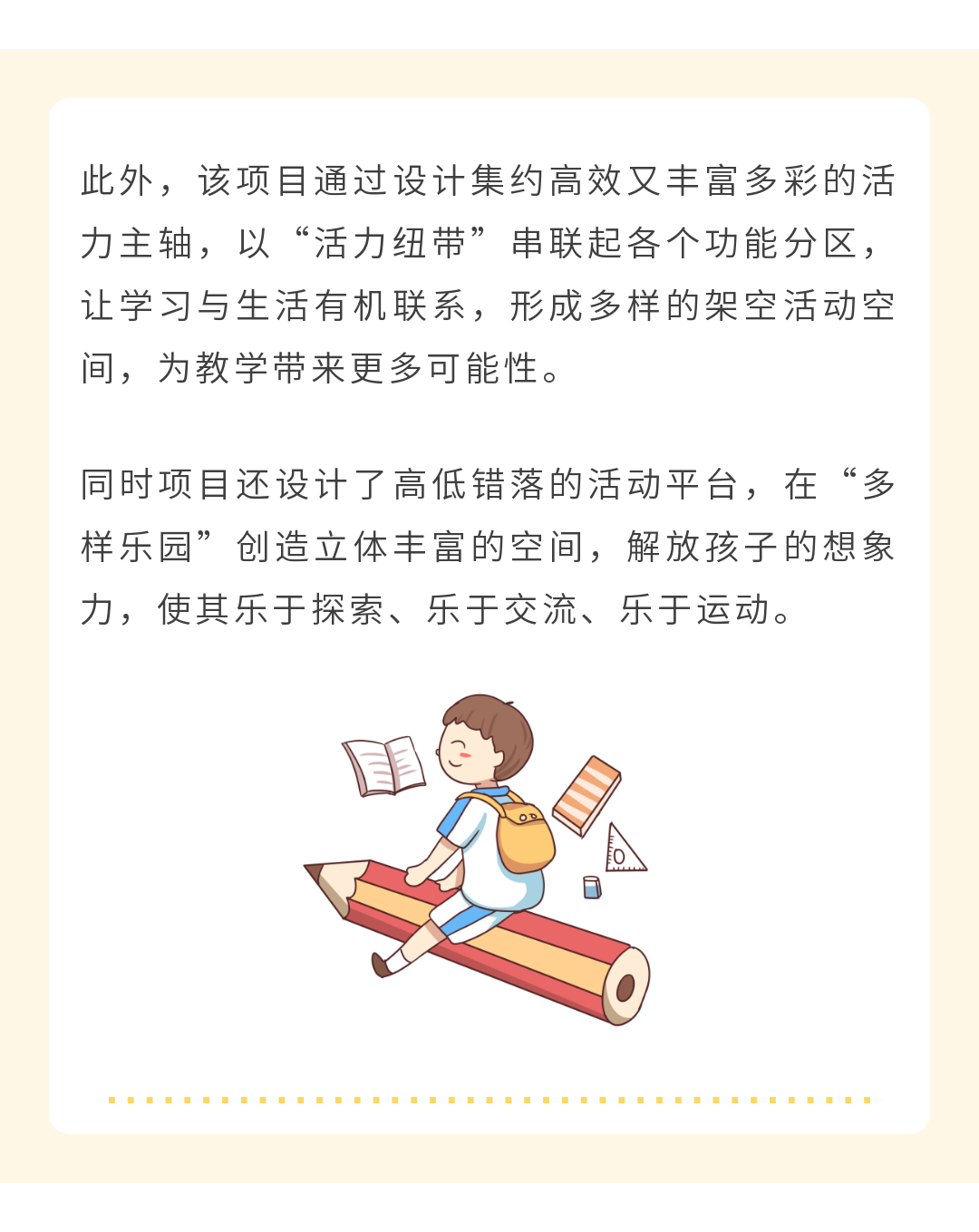 学校规划建设教学综合体、教学辅助用楼、综合楼、体育馆、300米标准田径场等设施。项目周边道路体系完整,交通可达性强。