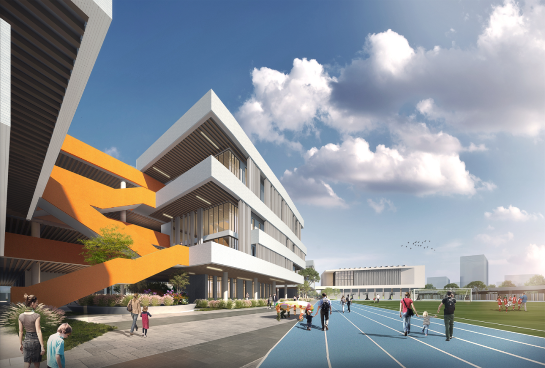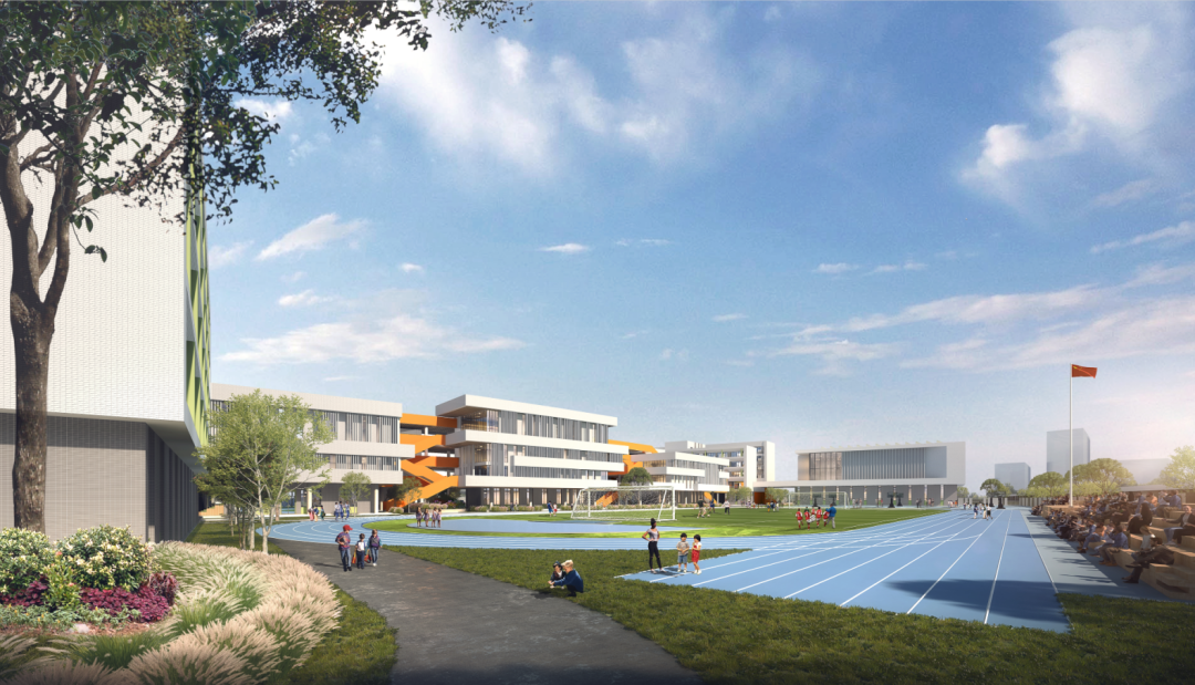 学校东南侧滨水,西侧为城市绿化带,景观资源丰富,绿地率达35%。学校规划建设教学综合体、教学辅助用楼、综合楼、体育馆、300米标准田径场等设施。项目周边道路体系完整,交通便利。