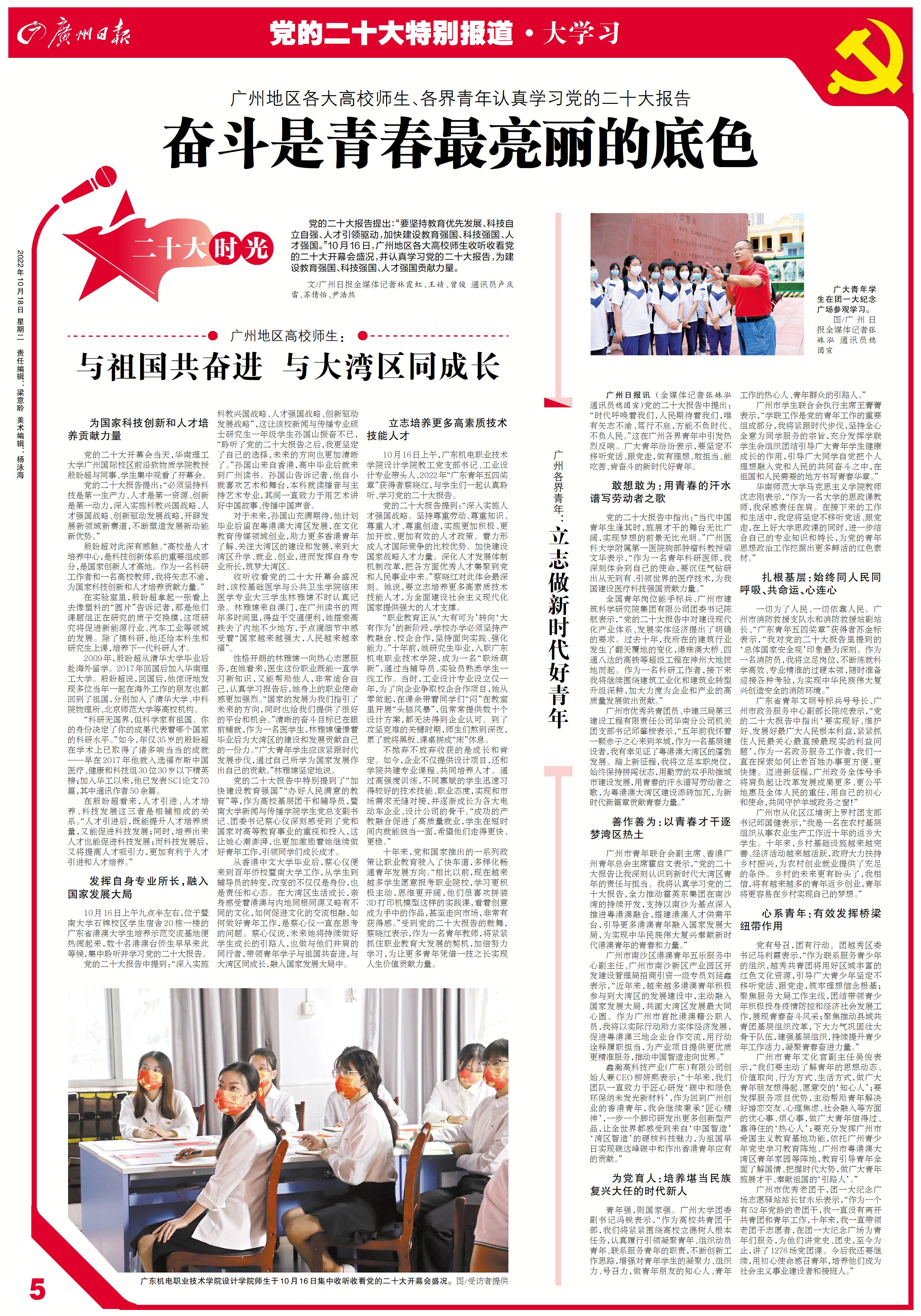 党的二十大报告提出:“要坚持教育优先发展、科技自立自强、人才引领驱动,加快建设教育强国、科技强国、人才强国。”10月16日,广州地区各大高校师生收听收看党的二十大开幕会盛况,并认真学习党的二十大报告,为建设教育强国、科技强国、人才强国贡献力量。