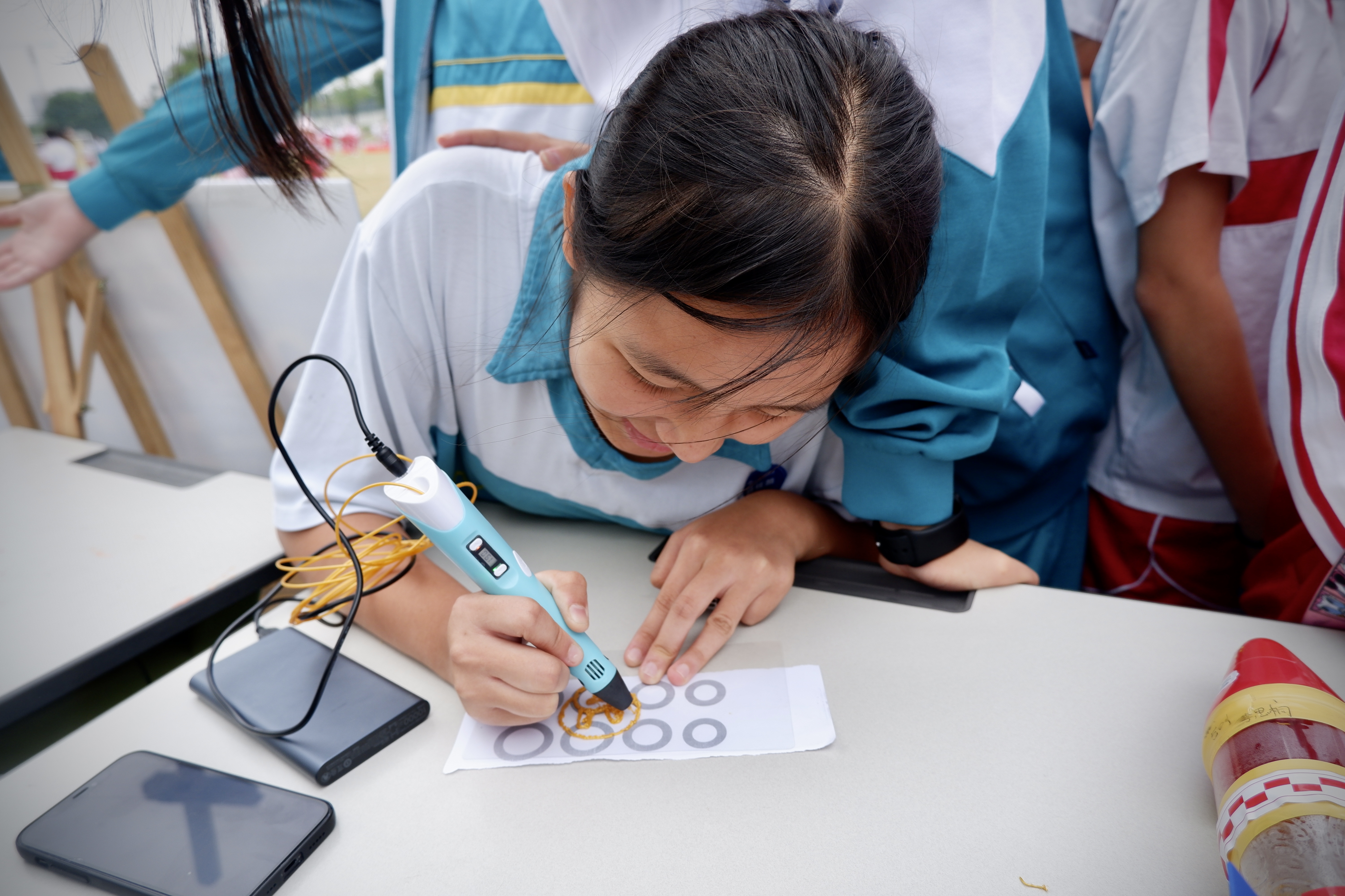 一位初中生在用3D打印笔画画。