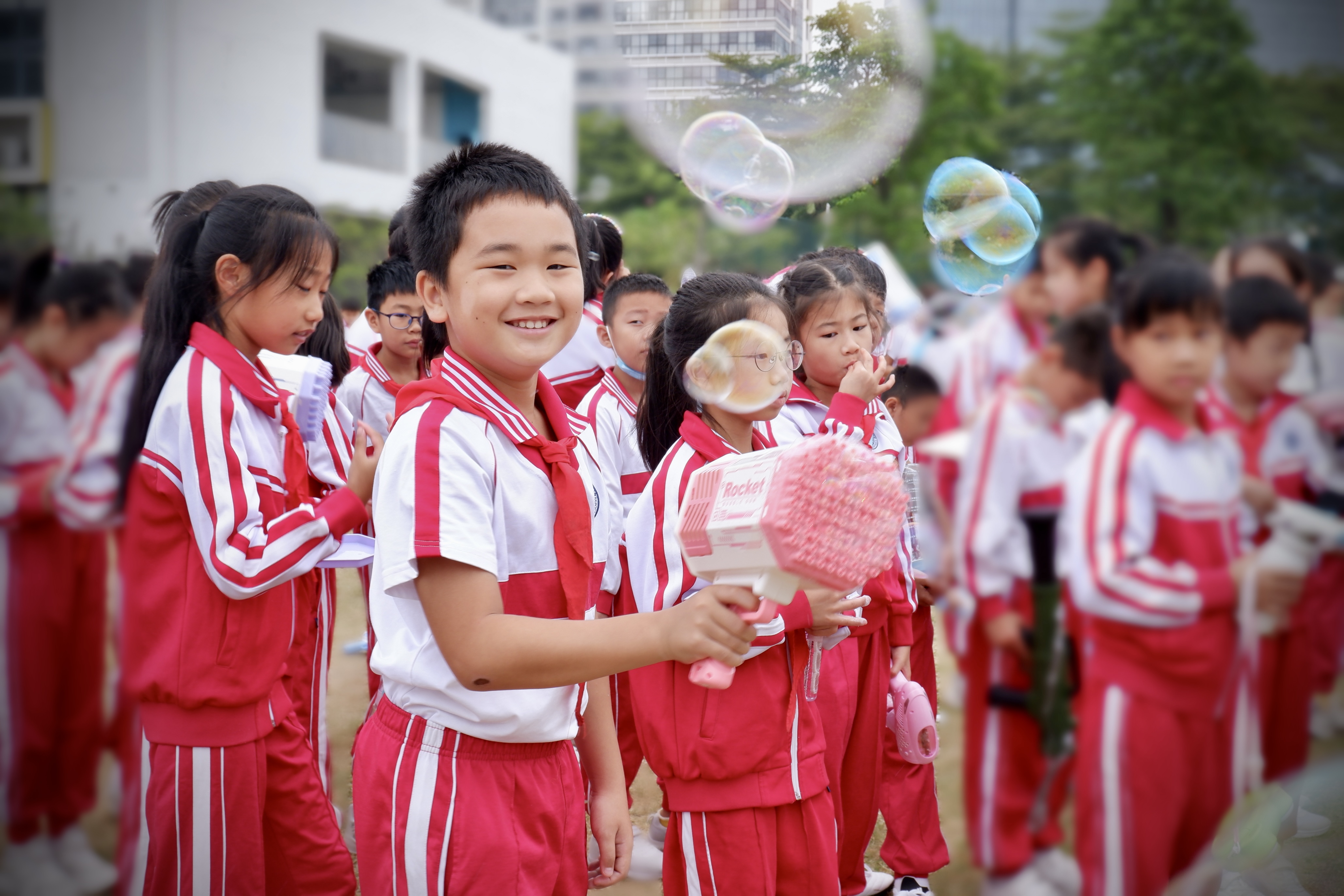 随着倒数“三二一”,水火箭发射,几位同学激动地发动了手上的泡泡机。10月18日,广州市番禺区番外外国语学校(以下简称“番外外国语学校”)的同学们齐聚操场上,迎接该校第五届科技节的开幕。
