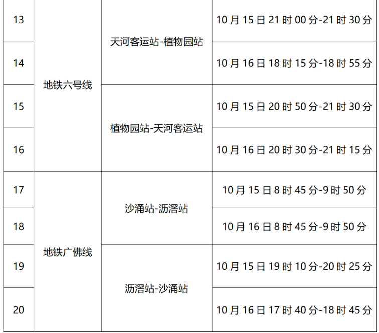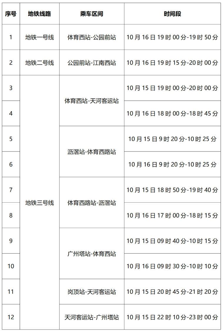 因疫情防控需要,在10月15日-16日以下时间段相应区间站曾乘坐广州地铁一号线、二号线、三号线、六号线、广佛线以及在相应站内换乘的市民朋友,请主动向社区报备并就近进行核酸检测,做好3天3检及自我健康监测,如出现不适,请在做好个人防护基础上及时就医。
