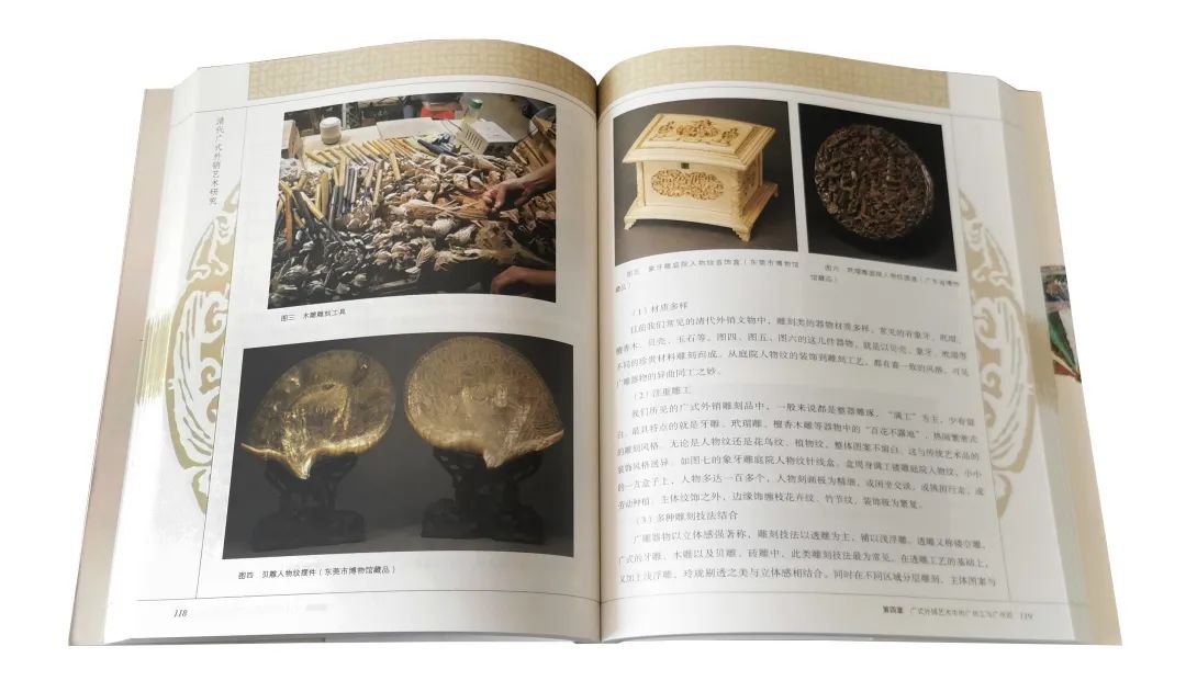 据考证研究,在西汉南越国王墓中出土的凸瓣纹银盒就是舶来品,是岭南海上丝绸之路中外交流的实物见证。向海而生的广货不断汲取中原文化的营养,同时采纳海外文化的浩博多样,逐渐形成商业性和世俗性的特点。经隋唐宋元明清历代的融合发展,工艺更加精巧,专业门类繁多。自从世界进入大航海时代,随着全球贸易网络的建立,广式外销艺术品便应运而生。看到书中一个小小的檀香木折扇或首饰盒上雕刻的亭台人物故事,揣摩着几百年前的工匠凿粗掘细,用浮雕、透雕、圆雕的各种技法,把一块厚重木料,变成一件件精美的艺术品,现在还保留着古远的幽香,是多么令人神往的体验。