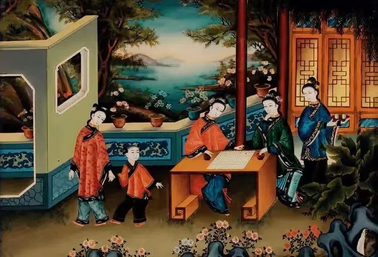 广州佚名画家绘仕女对弈玻璃油画 纵40厘米 横60厘米 19世纪初 玻璃油彩