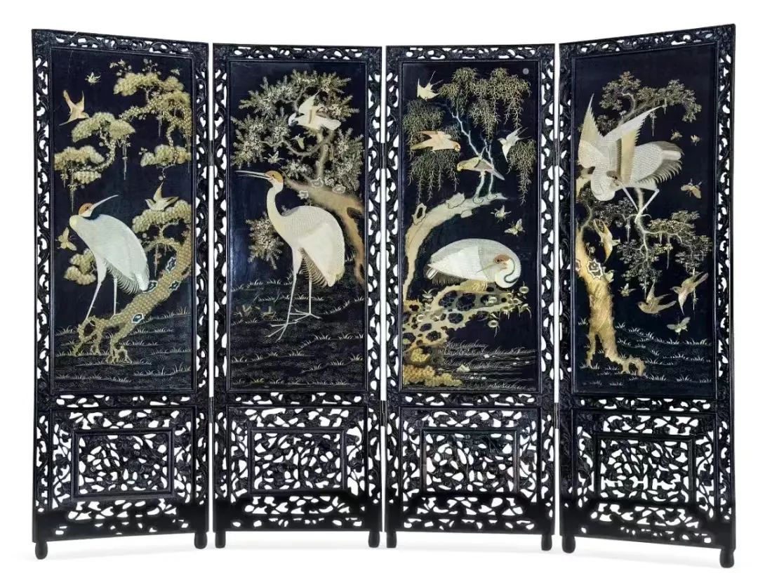 透雕酸枝框广绣松鹤延年图四围屏屏风 广州十三行博物馆藏品